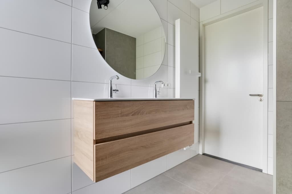 De moderne badkamer is praktisch en ruimtelijk ingericht, met witte wandtegels en betonlook vloertegels, die ook op de wanden terugkomen. Je vindt er een zwevend toilet, een ruime inloopdouche met nis, een breed wastafelmeubel met dubbele kraan, verwarmde spiegel en vloerverwarming. De houten elementen maken de gedachte voor een ontspannen omgeving helemaal af. Dit is de ideale plek om tot rust te komen na een lange dag.
