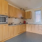 Aansluitend is de open keuken gesitueerd. Deze is in een L-vorm gerealiseerd waarbij houttinten de hoofdrol spelen. De keuken is voorzien van diverse inbouwapparatuur als een inductie kookplaat, combi oven, aparte koelkast en vriezer en een spoelbak. Verder is de keuken afgewerkt met voldoende boven- en onder kastruimte en een granieten aanrechtblad met waterkering. Vloerafwerking met zeil is handig in deze ruimte van het huis.