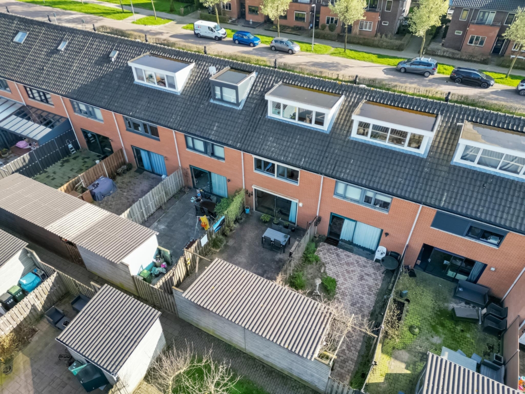 Buiten strekt de achtertuin zich uit als een oase van rust, met een schuifpui die buiten naar binnen haalt. Een onderhoudsarme tuin met opties tot een terras aan huis en/of een lounge hoek op een zonnige locatie. Een houten berging biedt ruimte voor de nodige opslag. De achterom is handig om met de fiets in de tuin te komen.