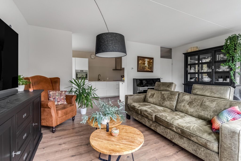 Het woongedeelte is royaal en profiteert van veel ramen, wat het appartement heerlijk licht maakt. Alle kozijnen zijn uitgevoerd in kunststof en voorzien van triple beglazing, wat niet alleen energiebesparend is, maar ook zorgt voor extra geluidsisolatie. De laminaatvloer, die overigens overal gelegen is exclusief de werkkamer, geeft het geheel een warme en huiselijke sfeer.