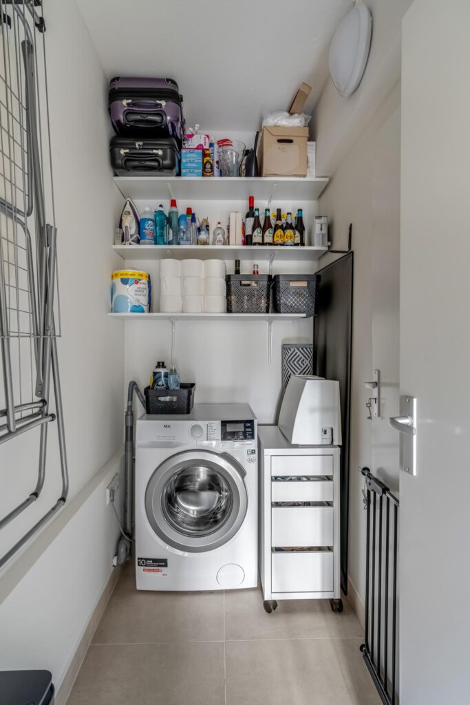 De moderne keuken is slechts twee jaar oud en biedt alles wat je nodig hebt voor het bereiden van de lekkerste maaltijden. De keuken is uitgevoerd in lichte kleuren met een mooi houtlook werkblad en greeploze kastjes voor een strakke look. Voorzien van moderne apparatuur zoals een grote koelkast, combi-oven, vierpits inductiekookplaat, vaatwasser, brede spoelbak én een extra kastenwand. Bovendien heb je vanuit de keuken toegang tot een tweede balkon – ideaal om even uit te waaien of van het groen om je heen te genieten.