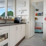 De keuken, met een landelijke uitstraling, heeft een houten blad en voldoende kastruimte. Uitgerust met een 5-pits gasfornuis, spoelbak, losse vaatwasser en een koel-vriescombinatie, is deze keuken perfect voor al uw kookavonturen. Vanuit de keuken loopt u door naar een kleine slaapkamer, momenteel in gebruik als kinderkamer, waar ook de wasmachine en droger staan.