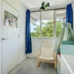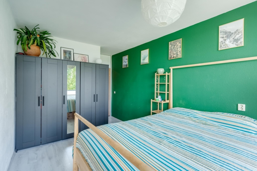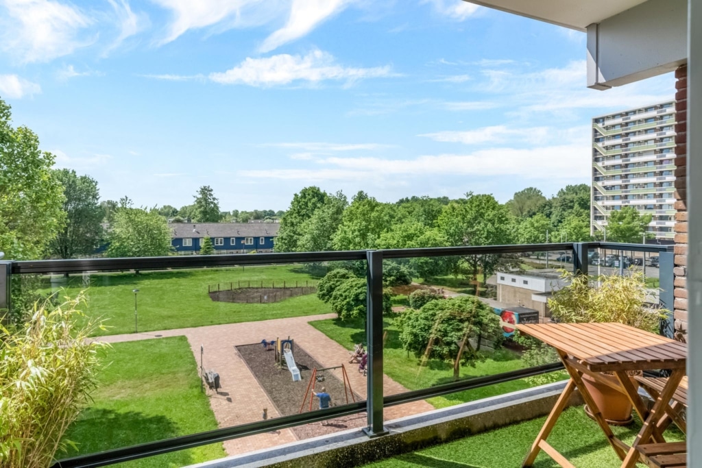 Aan de achterzijde van het appartement bevindt zich de lichte woonkamer met grote ramen en toegang tot het heerlijke balkon. Hier ligt een nette laminaatvloer en de kamer biedt een vrij uitzicht op een parkje met speeltuin. Het balkon is ruim genoeg voor een zitje, waar u kunt genieten van de buitenlucht en het groene uitzicht.