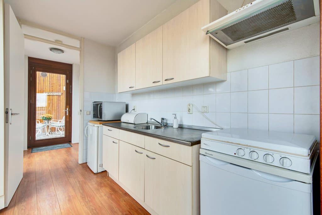 Aan de andere zijde van het appartement, waar de open keuken de verbintenis vormt, vinden we de ruime woonkamer met berging en zonnige balkon. De keuken is in een rechte vorm en eenvoudig opgesteld.