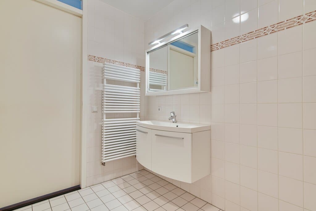 De badkamer is standaard opgesteld met een volledige witte betegeling en voorzien van een douche hoek, wasmeubel met wastafel en designradiator. Wenst u een ligbad dan zijn er voldoende