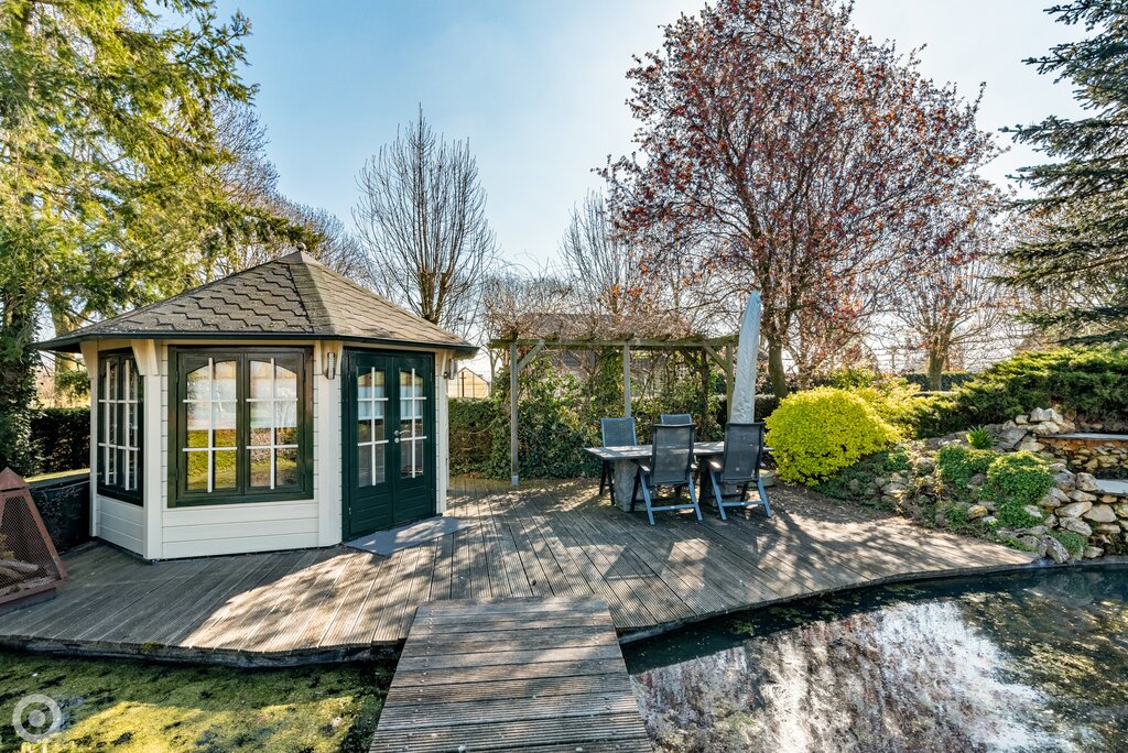 Een ander bijgebouw op dit prachtige perceel is het tuinhuis. En niet zomaar een ’tuinhuis’. Bij de vijverpartij met waterval, waar een vlonder met terras is gerealiseerd, staat een compleet ingerichte Finse blokhut met openslaande deuren. Met compleet ingericht bedoelen we een kleine keuken met koelkast en spoelbak, elektrische haard, strakke laminaatvloer, raampartijen met spinners, verlichting en elektra. Een fantastische ruimte om te ontspannen en nog meer van uw eigen perceel te genieten.