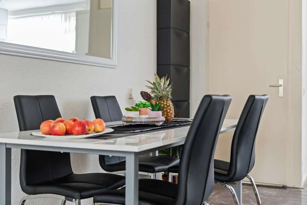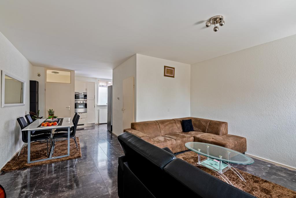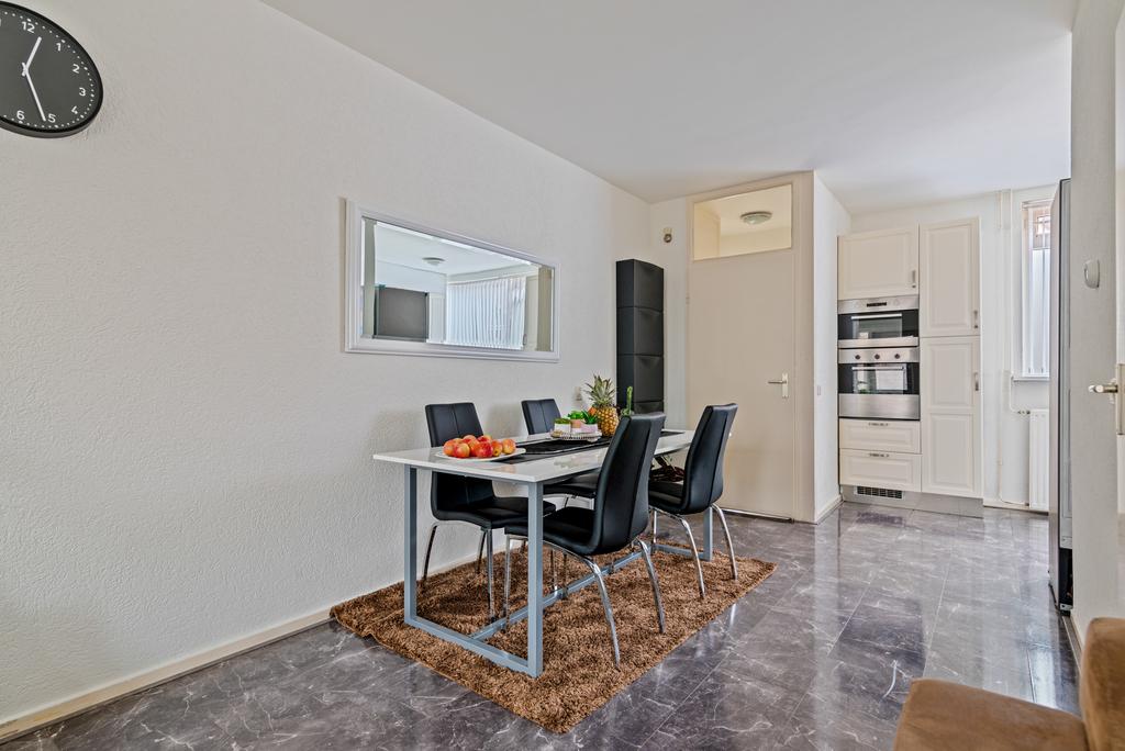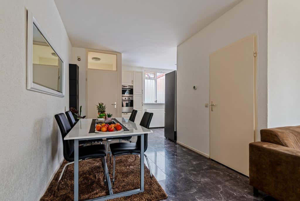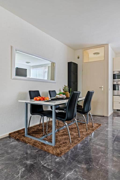 Middels een eettafel en een tussenhal, waar zich de trapopgang en het toilet bevindt, is de woonkamer gescheiden van de open keuken. Dit zorgt voor een speelse indeling. De entree en tussenhal zijn afgewerkt met een zwarte tegelvloer.