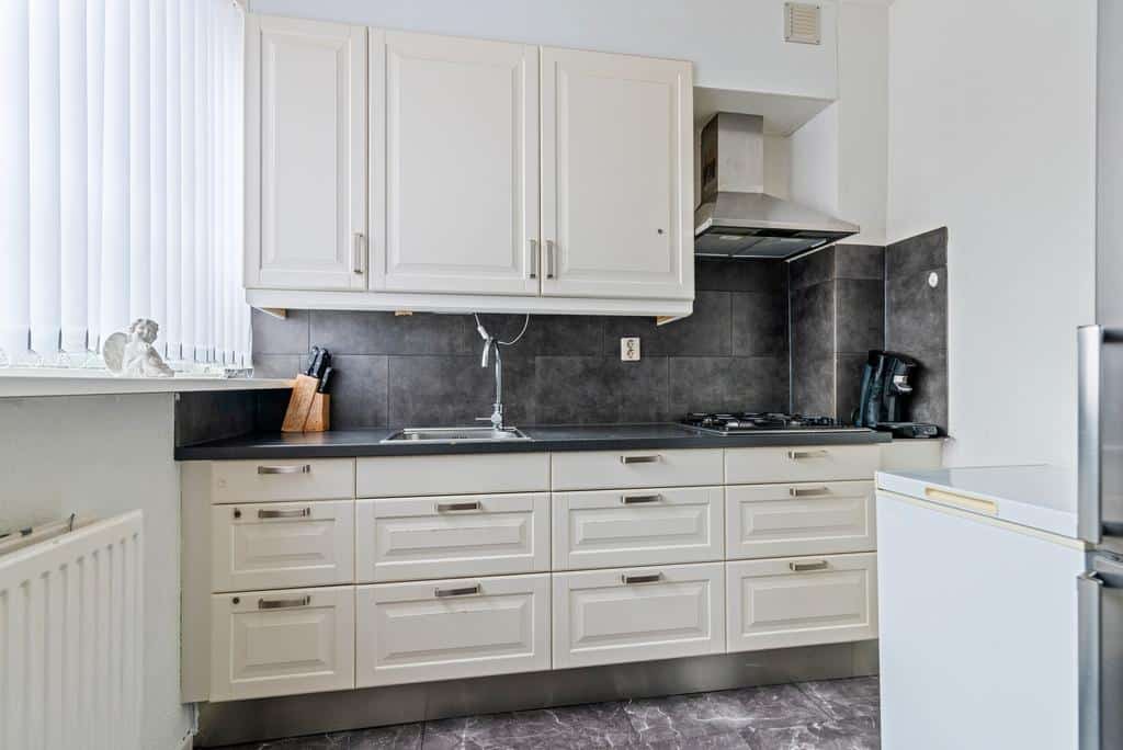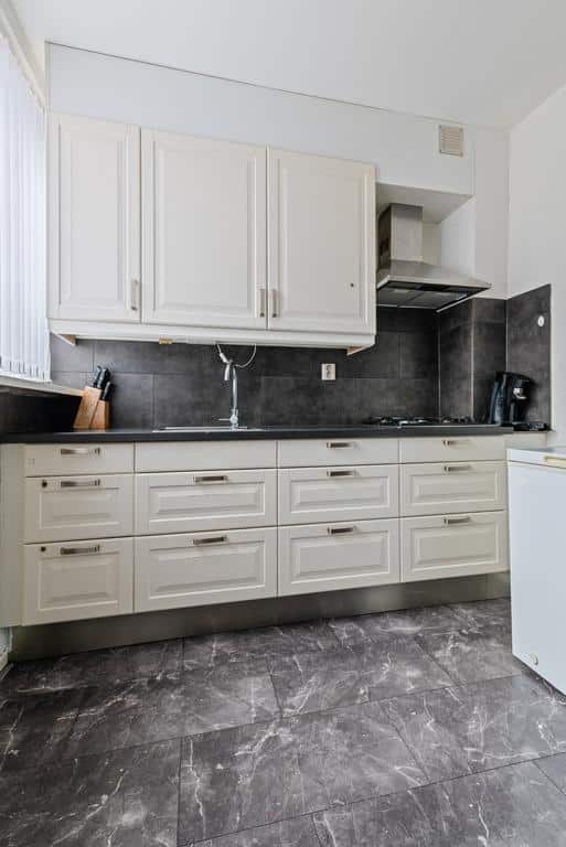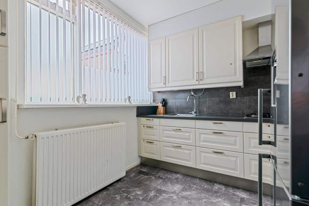ruimte. De keuken is afgewerkt met een donker blad en donkere wandbetegeling. Verder ingericht met een 4 pits gasfornuis met afzuigkap en spoelbak. Er zijn voldoende boven- en onderkasten aanwezig.