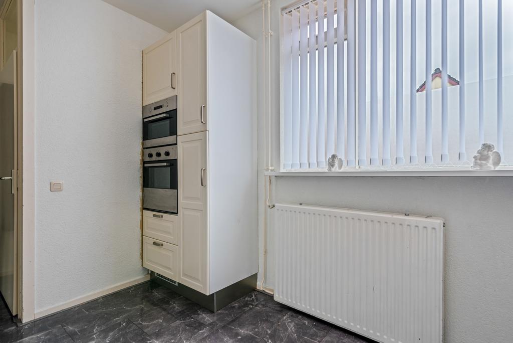 De keuken ligt aan de voorzijde en is in een rechte vorm opgesteld. Een externe kastenwand met ingebouwde oven en magnetron is aan de andere zijde gesitueerd.