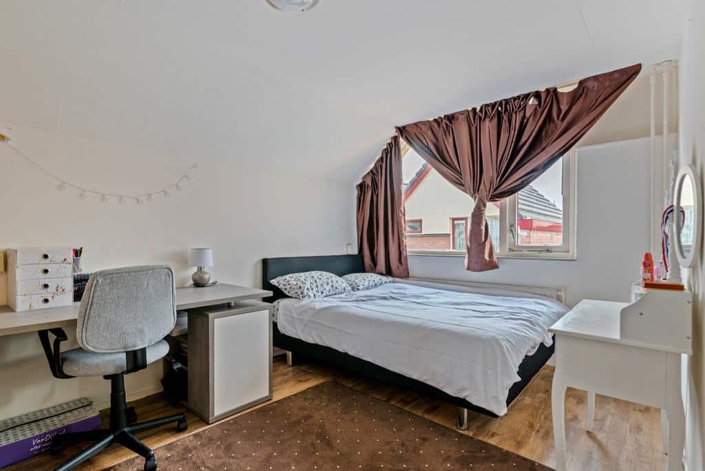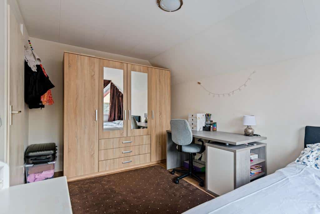 Via de hal in het hart van de woning gaan we naar de eerste verdieping waar de overloop toegang biedt tot 3 slaapkamers en de badkamer. Alle slaapkamers zijn netjes afgewerkt met een lichte laminaatvloer en voldoende raampartijen wat het wooncomfort verhoogt. Twee slaapkamers, waaronder de master suite, liggen aan de achterzijde en de laatste slaapkamer is aan de voorzijde gerealiseerd. De kamers zijn voorzien van gestucte wanden, dubbele beglazing en voldoende ruimte voor een ruim bed en (kleding)kast. De kleinste kamer is ook ideaal als werk/kantoorruimte.