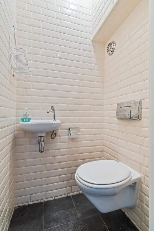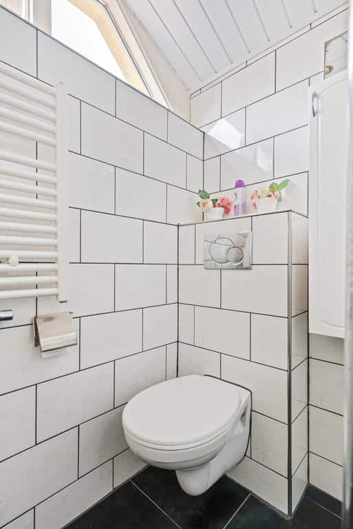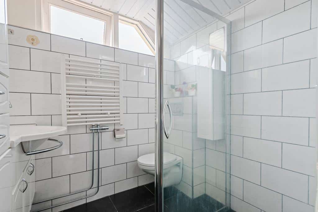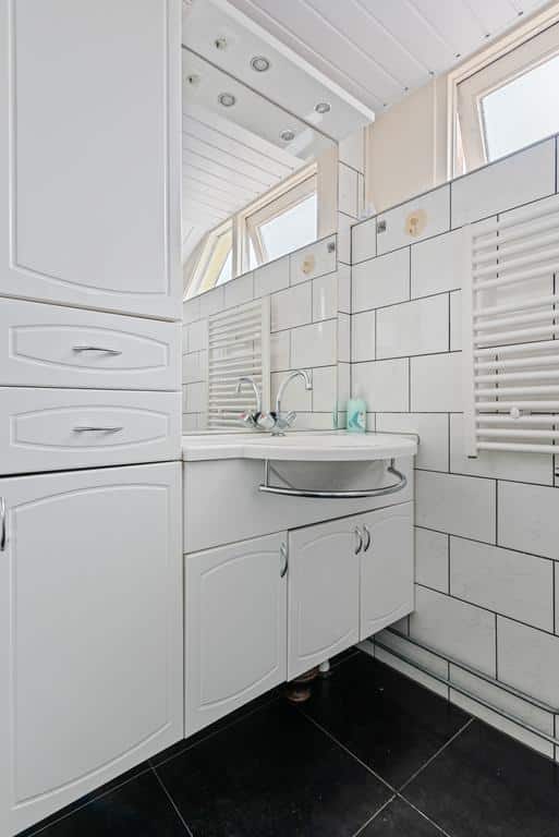De badkamer is praktisch en ruimtelijk opgesteld met een donkergekleurde vloertegel en witte wandtegel. Opvallend is de bewegingsruimte die ook optimaal benut is. De sanitaire ruimte is ingericht met een douchecabine, breed wastafel meubel met spots, designradiator en toilet.