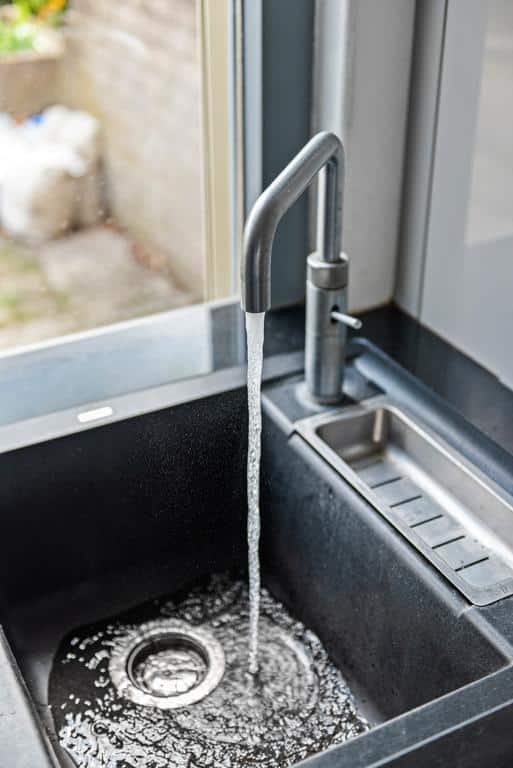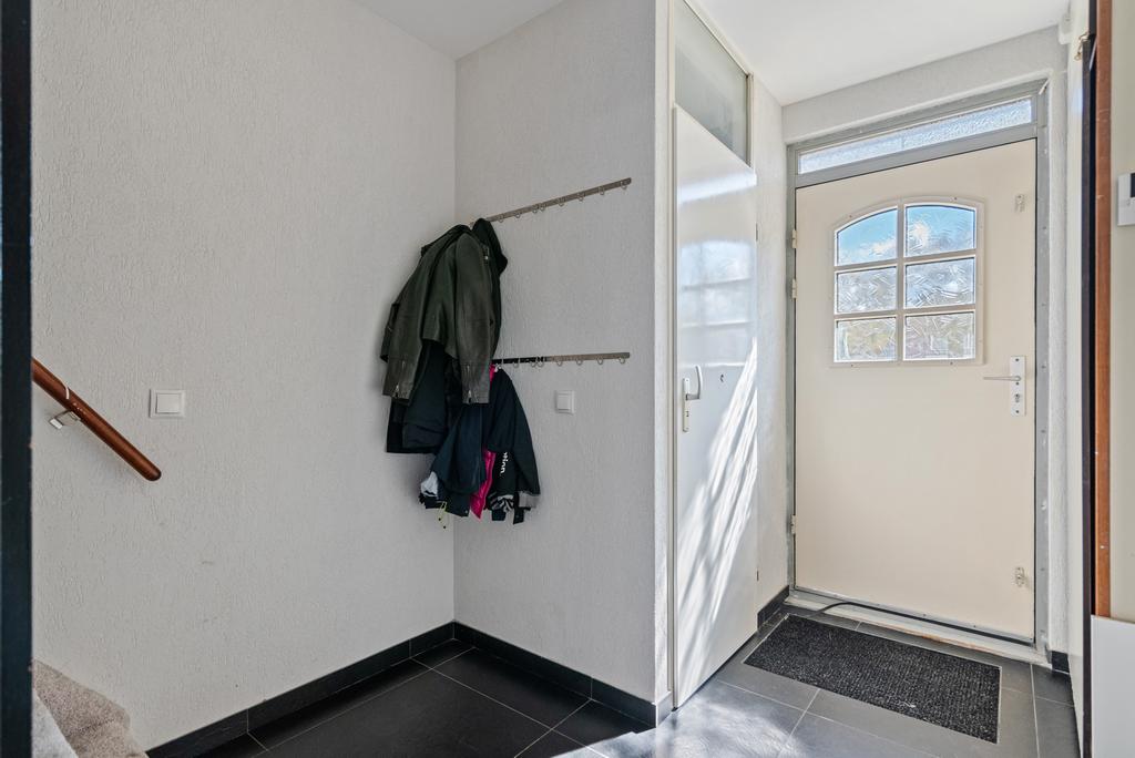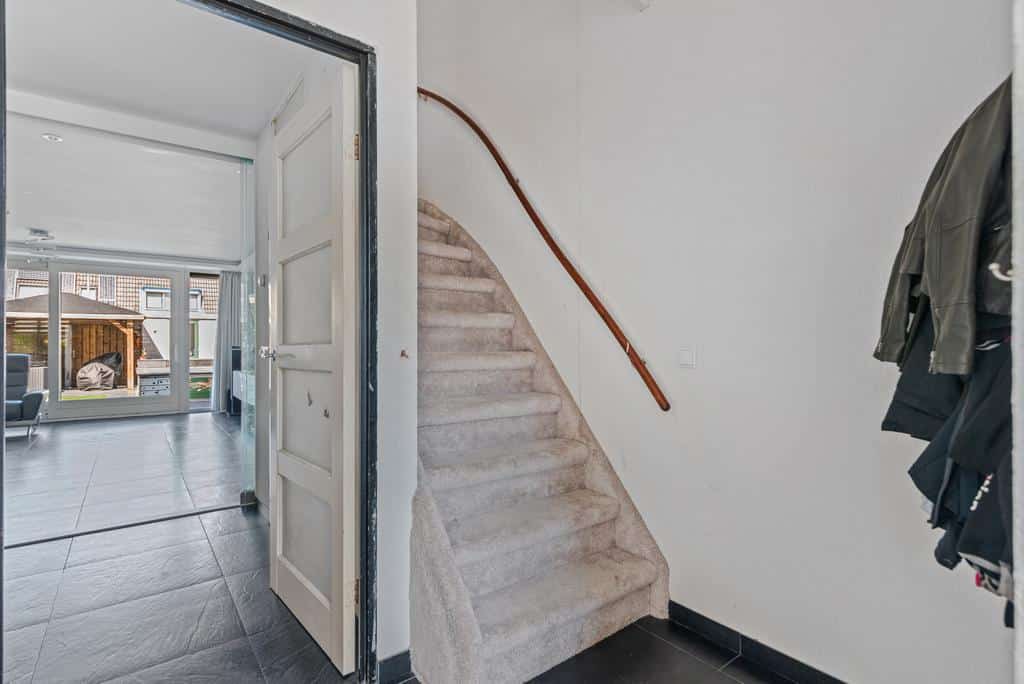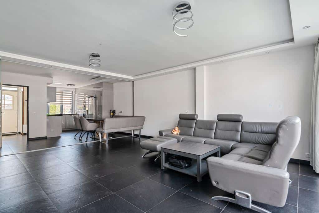Via de diepe voortuin, waar tevens een achterom is naar de achtertuin, betreden we de woning via de hal. Bij binnenkomst tref je direct de eenheid die op de begane grond is gerealiseerd. De robuuste, zwarte tegelvloer met hoog plintwerk,