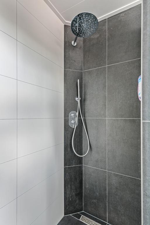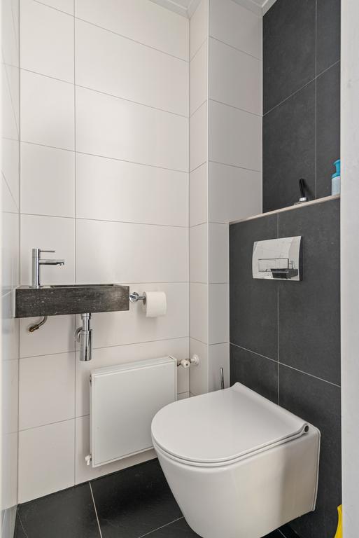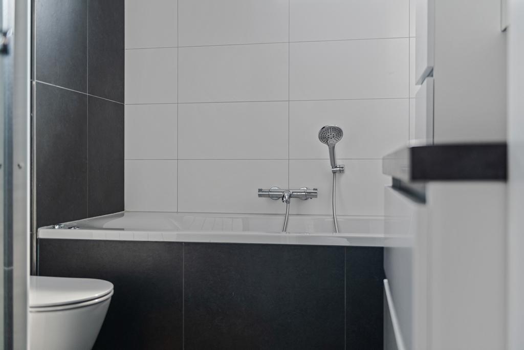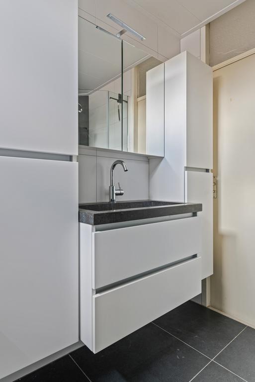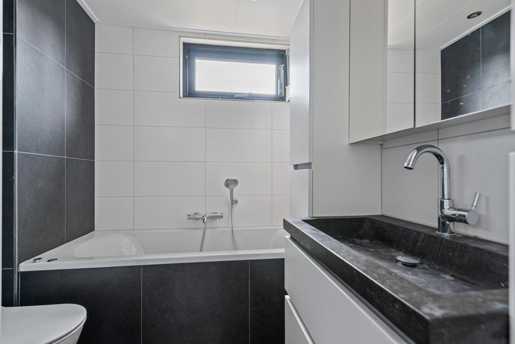 Een moderne, praktische badkamer met een ontspannen uitstraling. De badkamer bezit alles wat het nodig heeft. Een ligbad met handdouche en bubbelfunctie, hoek inloopdouche met regendouche, wasmeubel met brede wasbak, toilet en designradiator. Verder volledig betegeld met antraciet en wit tegelwerk en afgewerkt met een spanplafond met spots. Natuurlijke ventilatie middels een raam die tevens zorgt voor de nodige lichtinval.