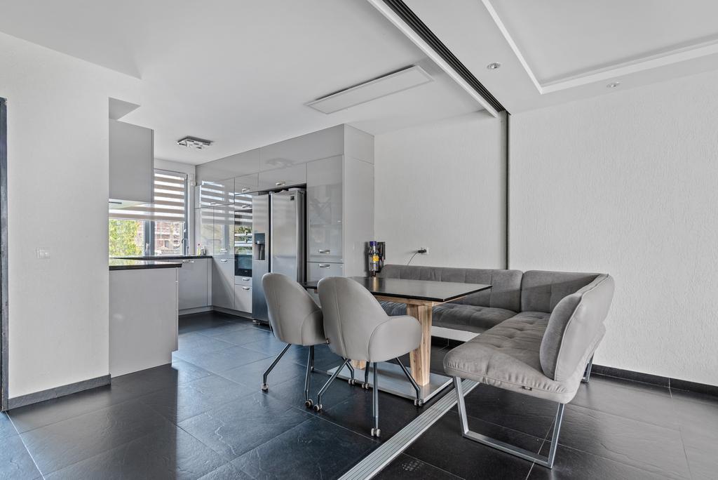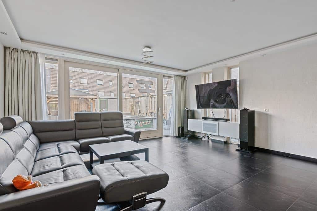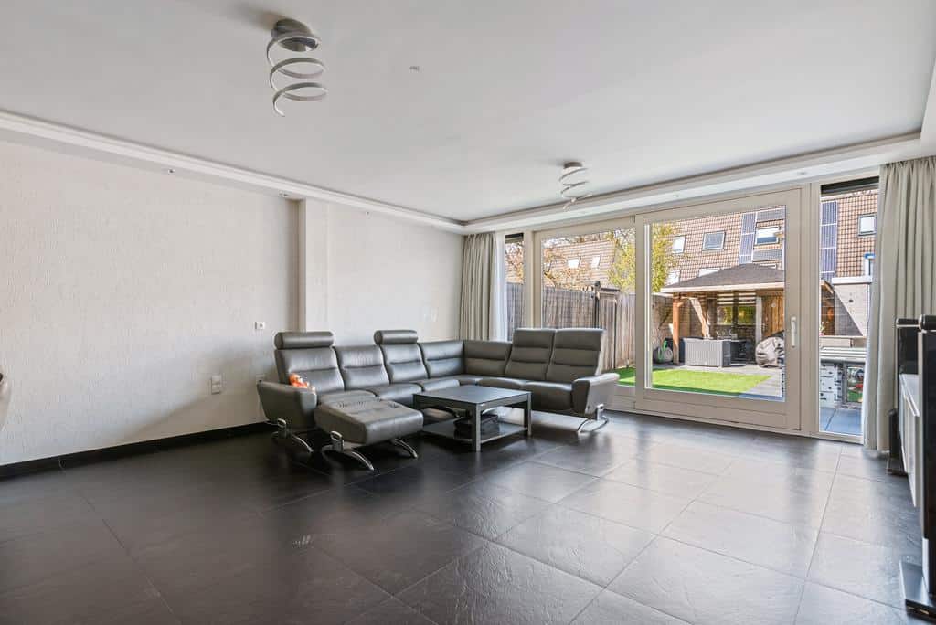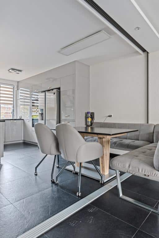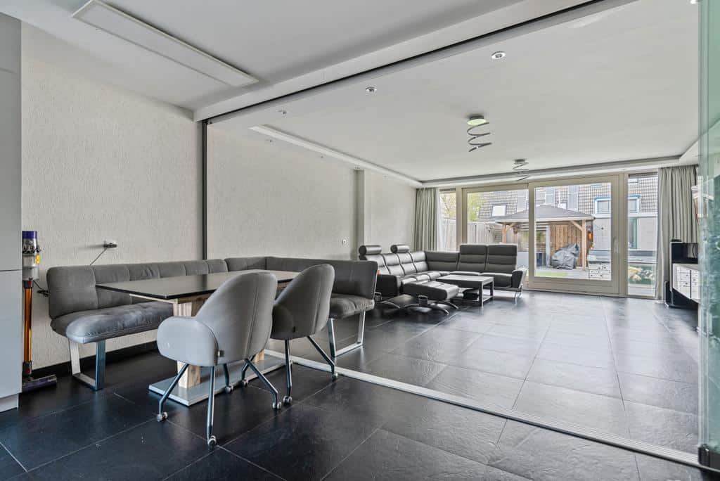 ontstaat een heerlijke hiërarchie met de zonnige tuin. De grote raampartijen en diepe achtertuin verhogen het wooncomfort. Er wordt meer dan voldoende ruimte geboden voor een zithoek en apart gedeelte voor de eettafel, zodat deze activiteiten goed gescheiden kunnen worden. Een mooie combinatie van neutrale kleuren en lichtinval maken dit woongedeelte tot een heerlijke leefruimte.