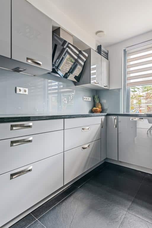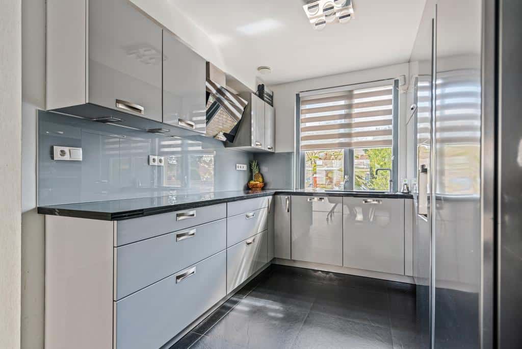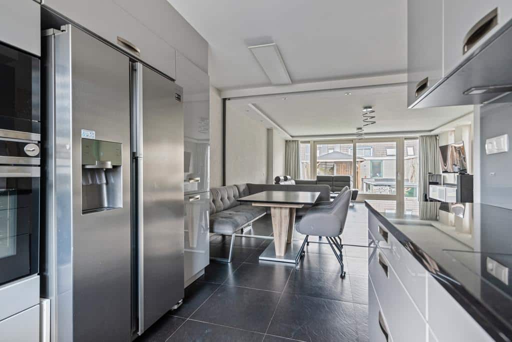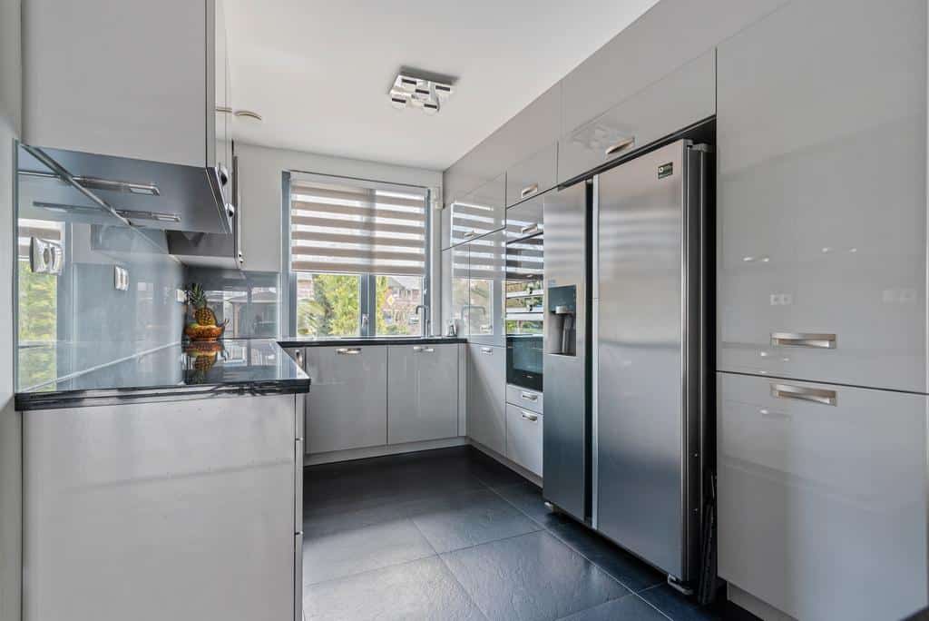 De moderne keuken is aan de voorzijde gelegen en biedt een vrij uitzicht over de voortuin en groen. De keuken is praktisch aan twee zijden gerealiseerd waardoor er veel werkruimte ontstaat. De keuken is modern, in hoogglans, afgewerkt met lichte taupe kleurstellingen en een zwarte granieten blad. In de keuken is er voldoende bewegingsruimte en is de nodige apparatuur aanwezig. Denk aan een keramische kookplaat met design afzuigkap, vaatwasser, oven, magnetron, ingebouwde spoelbak en een Amerikaanse koel/vriescombinatie (ter overname). Alles van het merk Siemens. Verder is er voldoende kastruimte in de vorm van Le Mans kasten, carrousel kast, pannenlades en diverse boven- en onderkasten. Het directe lichtinval verhoogt het comfort.