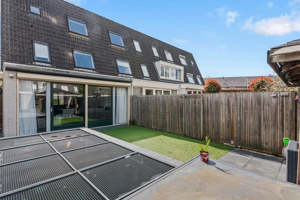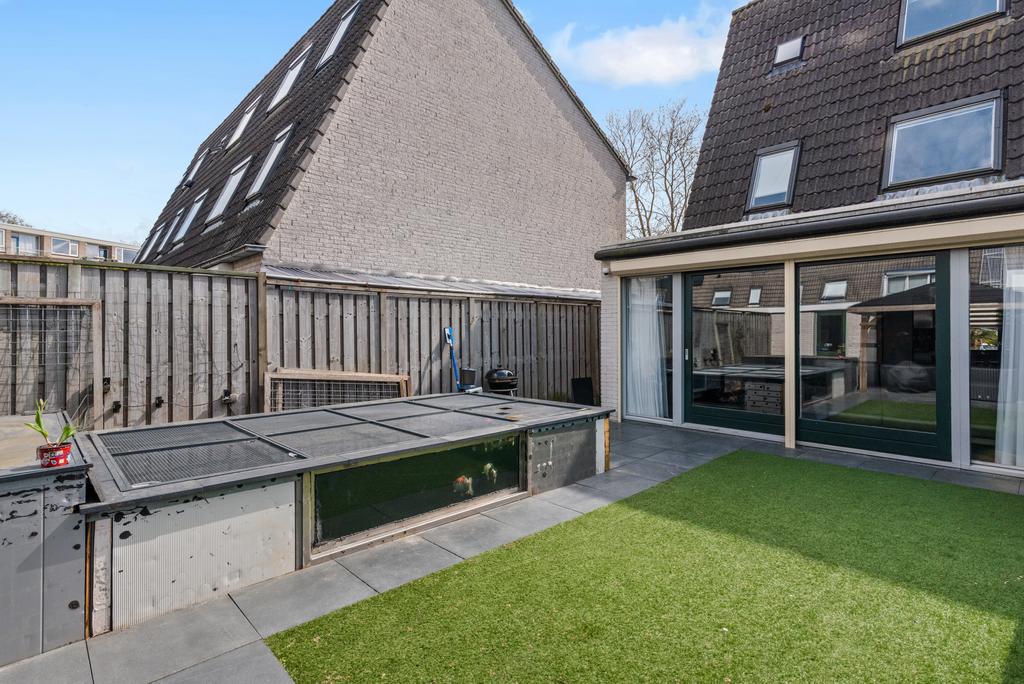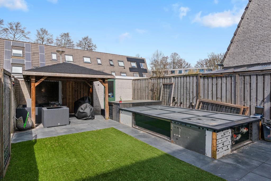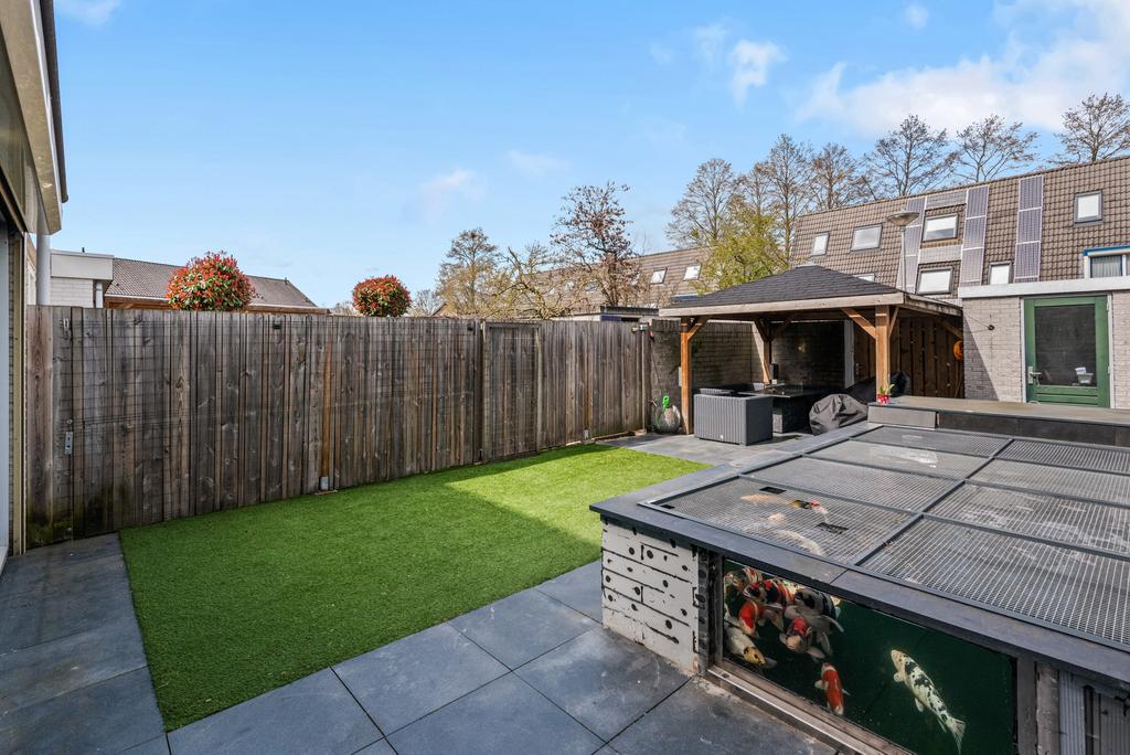 Deze zonnige tuin bezit zowel zon- als schaduwplekken en is voorzien van een moderne bestrating, een vijverpartij en een onderhoudsarme uitstraling met een kunstgras gazon. Een heerlijke toevoeging is de overkapping achterin de tuin. Voldoende privacy, een achterom en door de diepte en hoekligging voldoende zonuren. Achterin de tuin is nog een berging gesitueerd voor uw opslag en tuingereedschap.