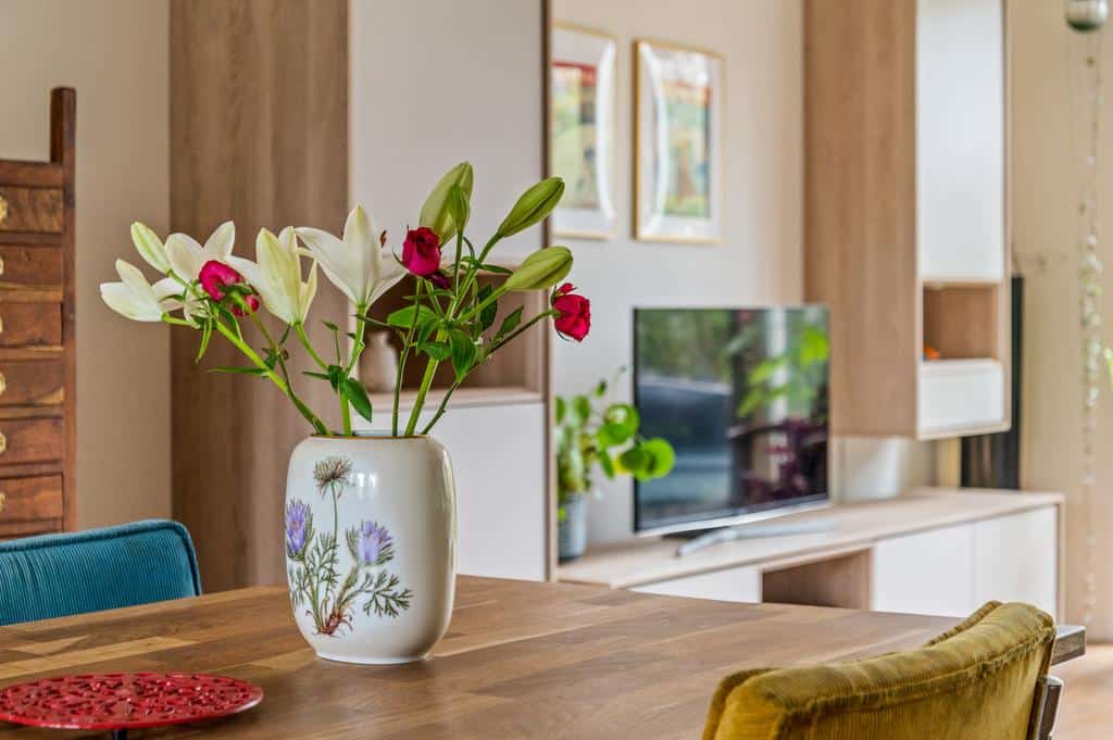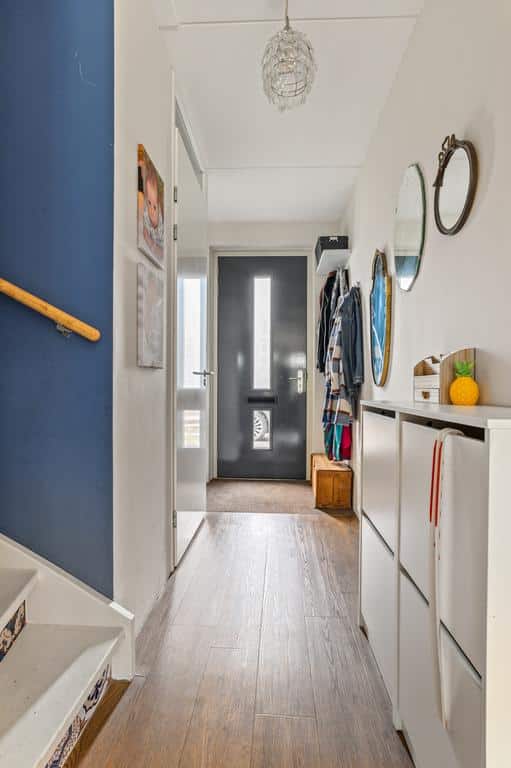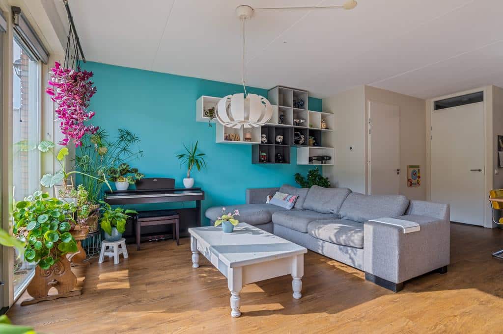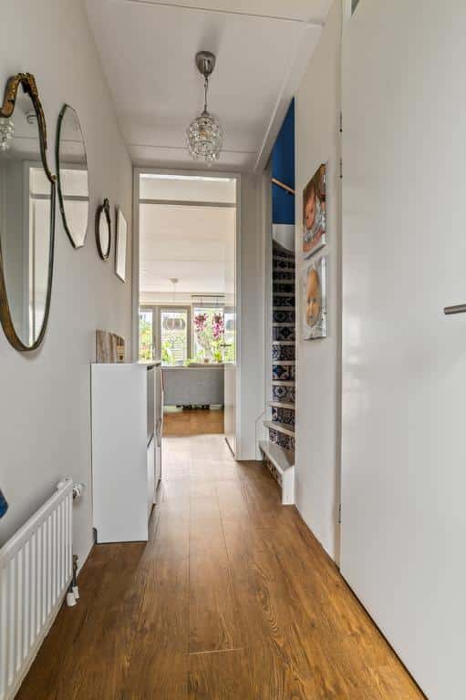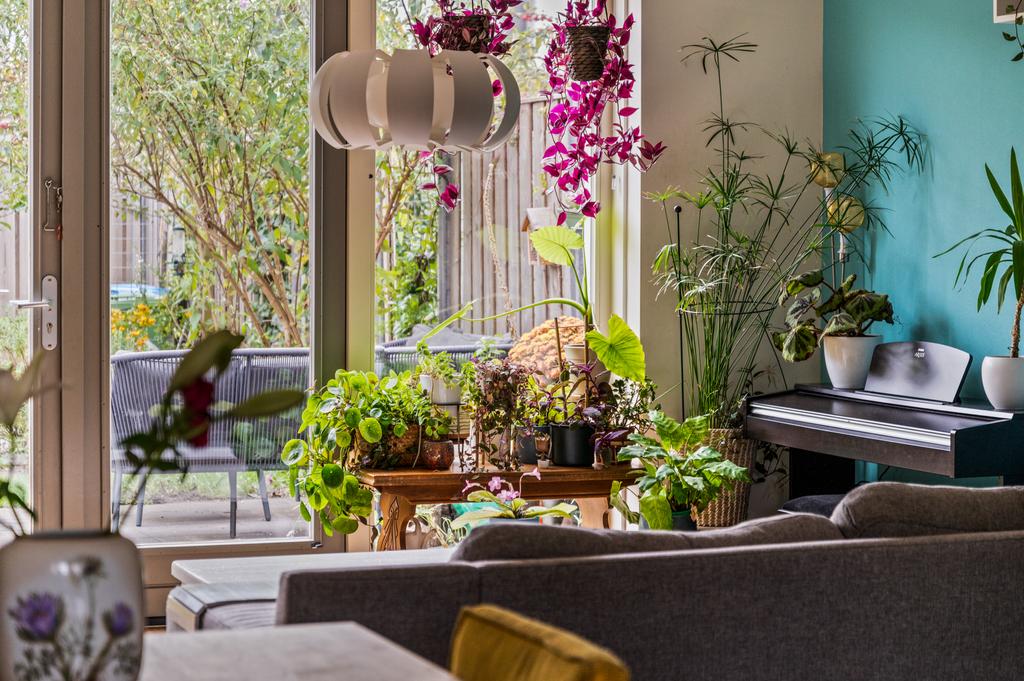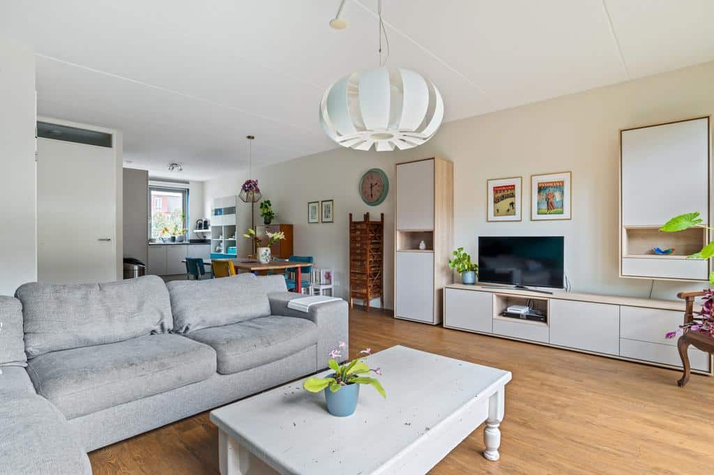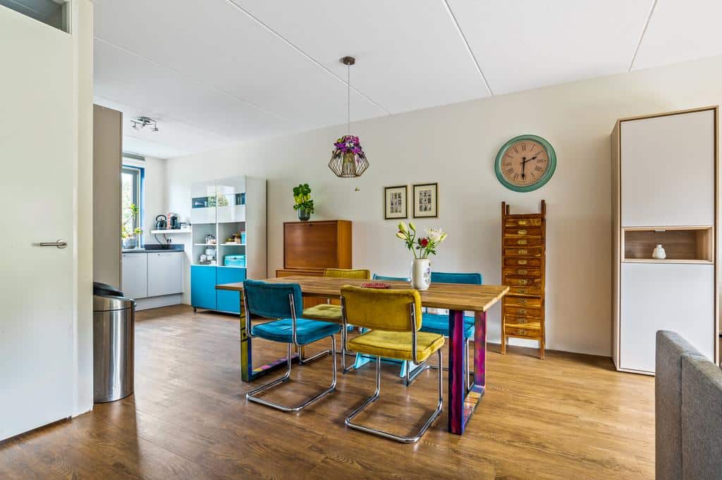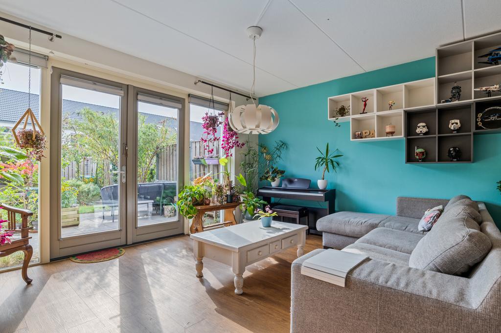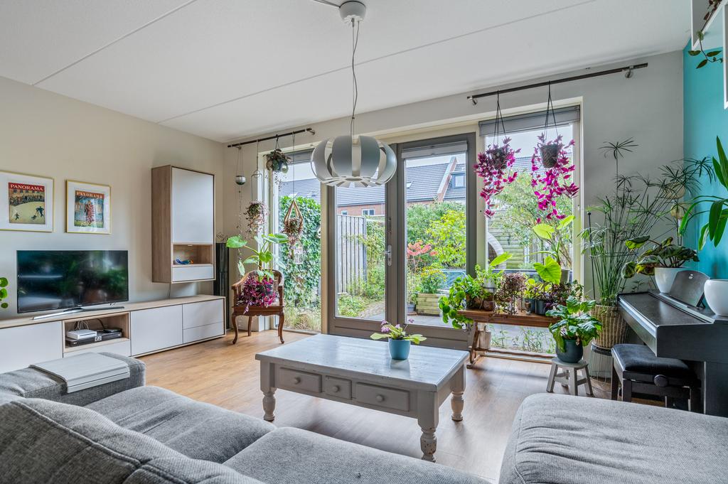 We betreden de woning in de hal met moderne meterkast en volledig betegeld toilet met fonteintje. Van daaruit lopen we het hart van de woning in. Bij het betreden van het woongedeelte gaat de aandacht direct naar de glazen pui met openslaande deuren en kamerhoge raampartijen welke zorgen voor een fijne lichtinval en een directe verbinding met de tuin. De woning heeft een goede en sfeervolle afwerking, wat je direct ziet en voelt als je binnen staat. De prachtige PVC vloer met vloerverwarming, de kleurencombinaties op de wanden en eenheid van materiaalgebruik maken het tot een sfeervol geheel. De ruime en lichte woonkamer is tuingericht en biedt voldoende ruimte voor een zithoek in combinatie met een ruime eettafel. Hier kijk je uit over de diepe achtertuin met houten berging. Met de openslaande deuren is het terras direct toegankelijk, wat de woning optisch nog ruimtelijker maakt. Een handige trapkast zorgt hier voor de nodige opslagruimte.
