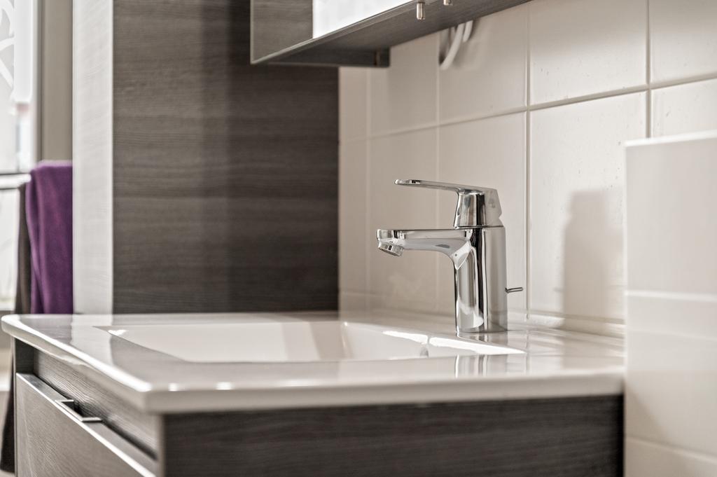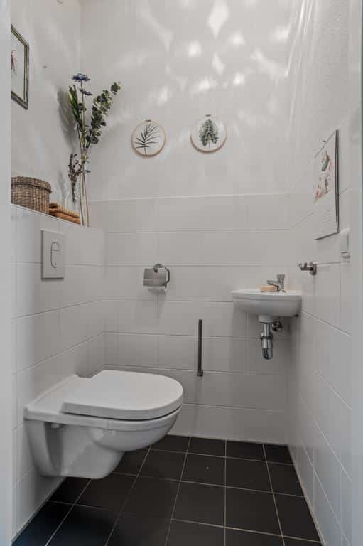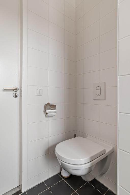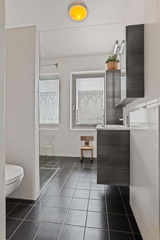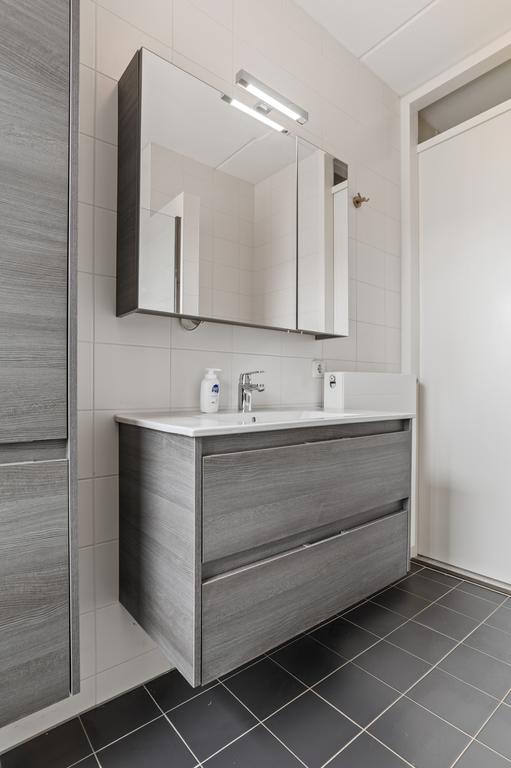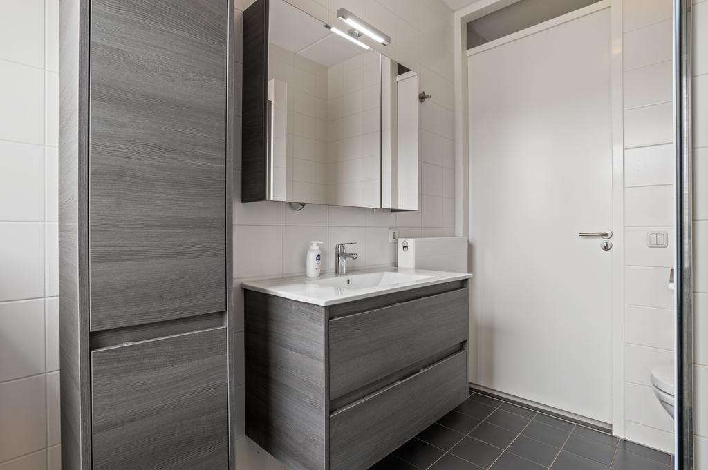 Ook in de badkamer is niets aan het toeval overgelaten. Een badkamer met genoeg bewegingsruimte en praktisch ingericht met hetgeen wat nodig is. Een neutrale afwerking met zwart en wit tegelwerk, antraciet gekleurde meubels en ruimtelijk ingericht