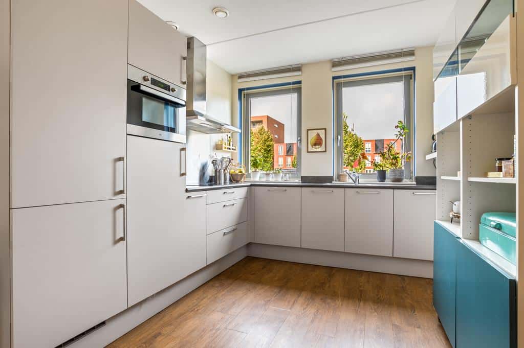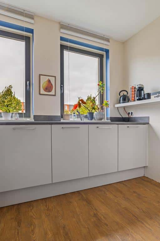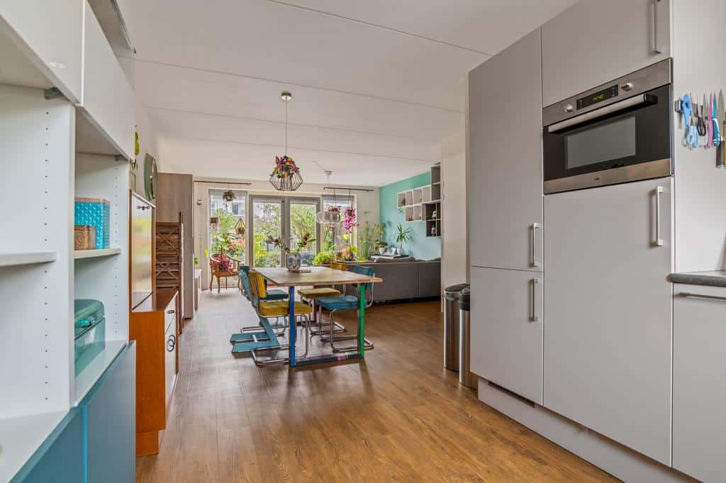 De keuken, welke in lichte tinten is opgesteld, is aan de voorzijde gelegen en biedt een breed straatbeeld. De keuken is in een L vorm gerealiseerd en voorzien van de nodige bewegingsruimte, kunststof aanrechtblad en inbouwapparatuur. Denk aan een 4 pits inductie kookplaat met afzuigkap, combi oven, vaatwasser (2021), koelkast en spoelbak. Middels boven- en onderkasten is er voldoende bergruimte aanwezig.
