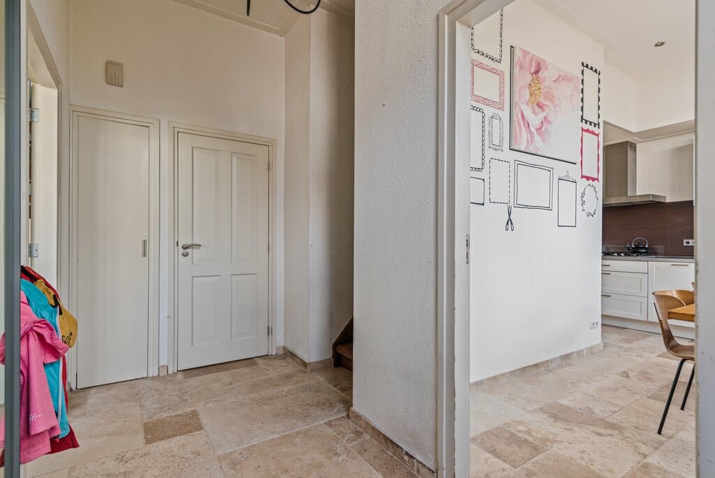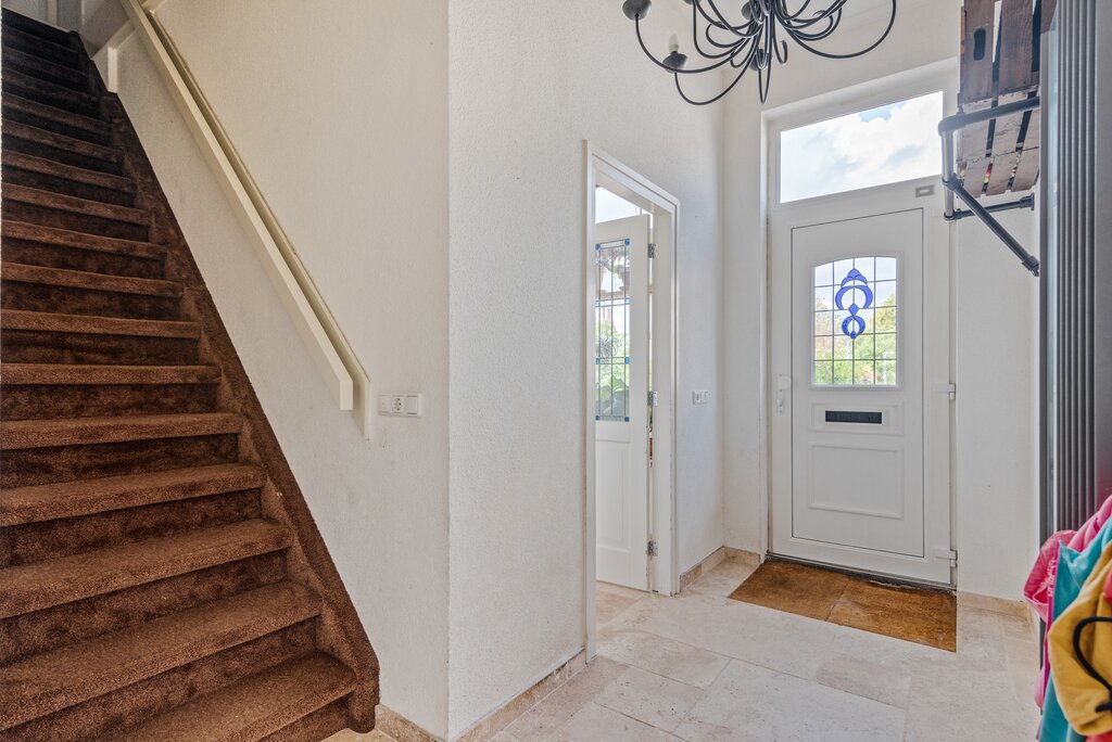 We komen hier binnen in het midden van de woning waar de ruime entree/hal het hart van de woning vormt. Met aan de linkerzijde een grote woonkamer en aan de rechterzijde de moderne woonkeuken. De hal is verder voorzien van een toilet, meterkast met moderne meters en de vaste trap naar de eerste verdieping. In de hal treffen we direct de mooie plavuizen vloer met bijbehorende hoge plint die over de gehele begane grond is gelegd inclusief vloerverwarming.