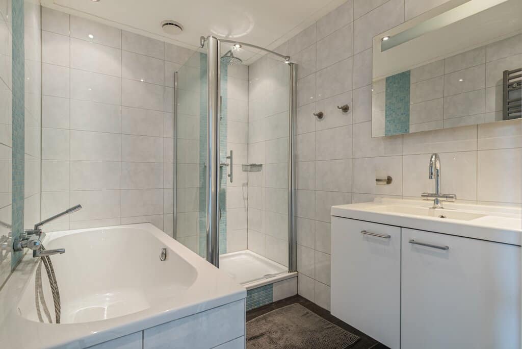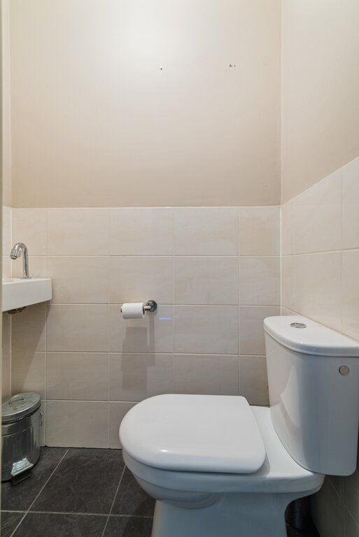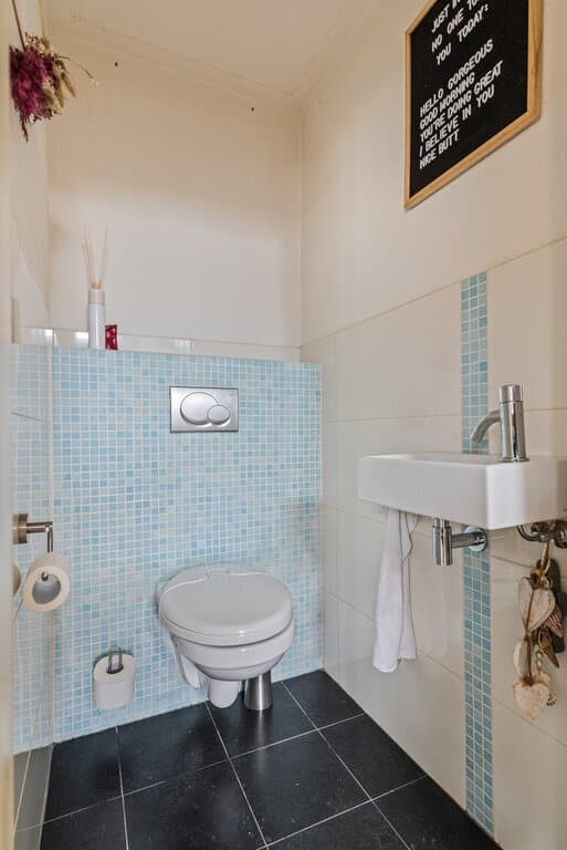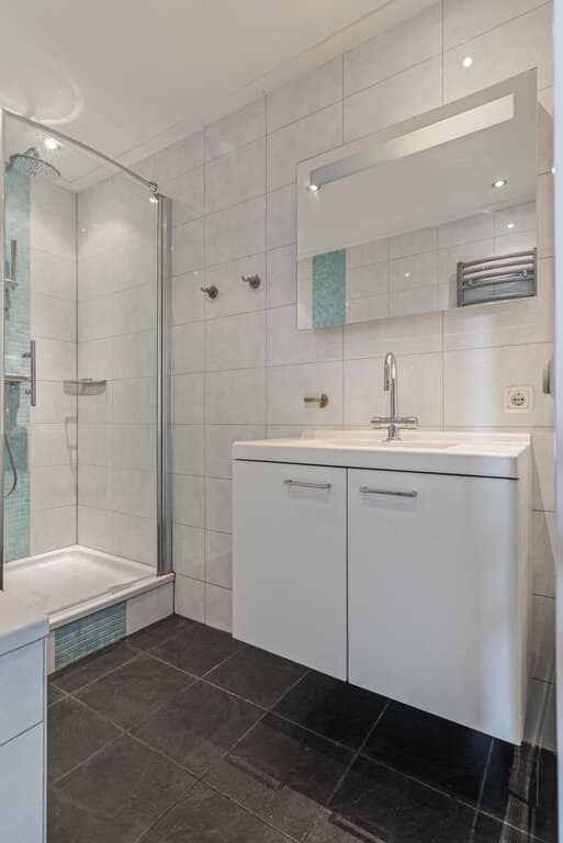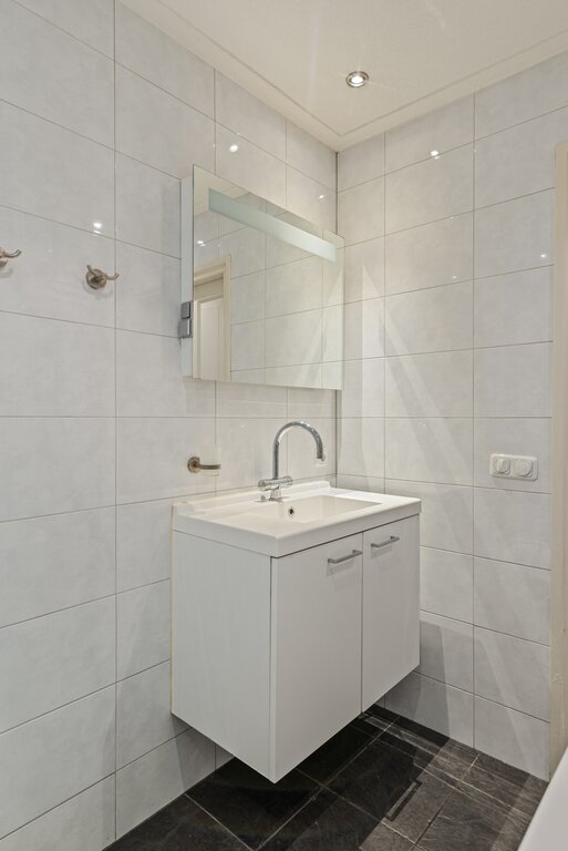 De sanitaire ruimte is op de begane grond gelegen en toegankelijk via de keuken. De badkamer biedt veel bewegingsruimte en is neutraal afgewerkt. Een donkere vloertegel in combinatie met een wit gekleurde wandtegel verzorgen hier de ontspannen sfeer. De witte kleuren in de inrichting versterken dit gevoel. Voorzien van een ligbad met handdouche, douche cabine met regendouche, breed wasmeubel met spiegel en designradiator. Voor het nodige comfort zijn er ingebouwde spots en mechanische ventilatie aanwezig.