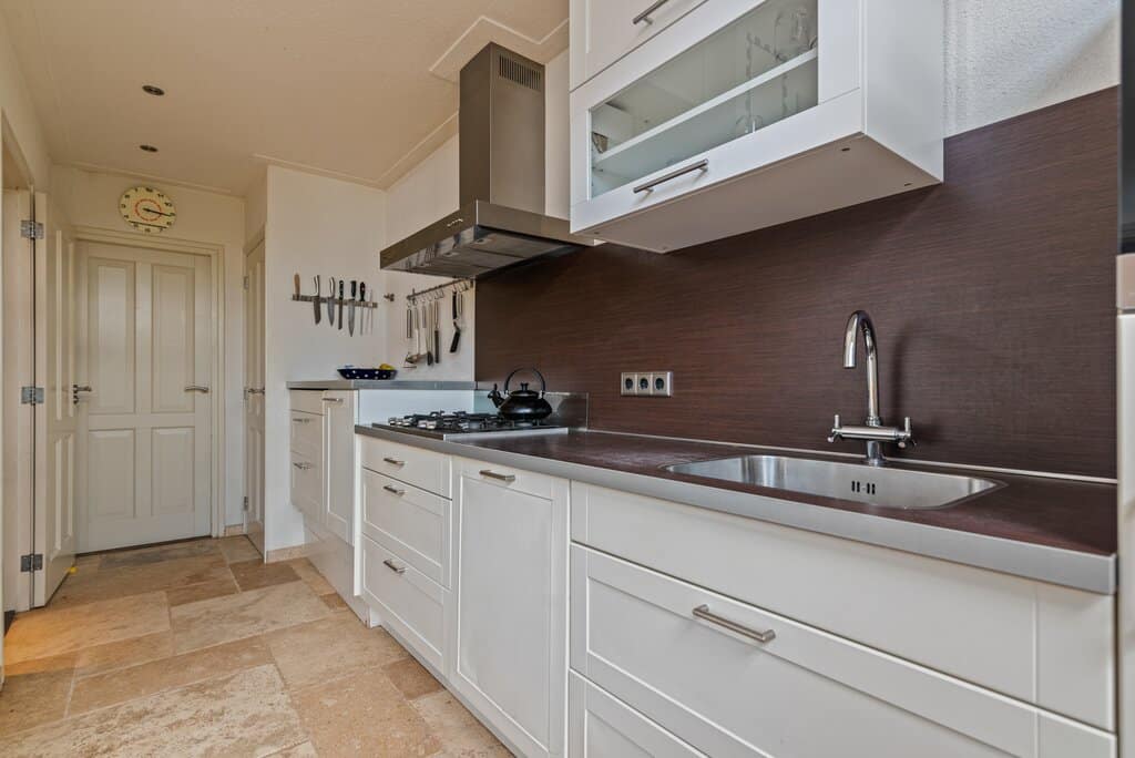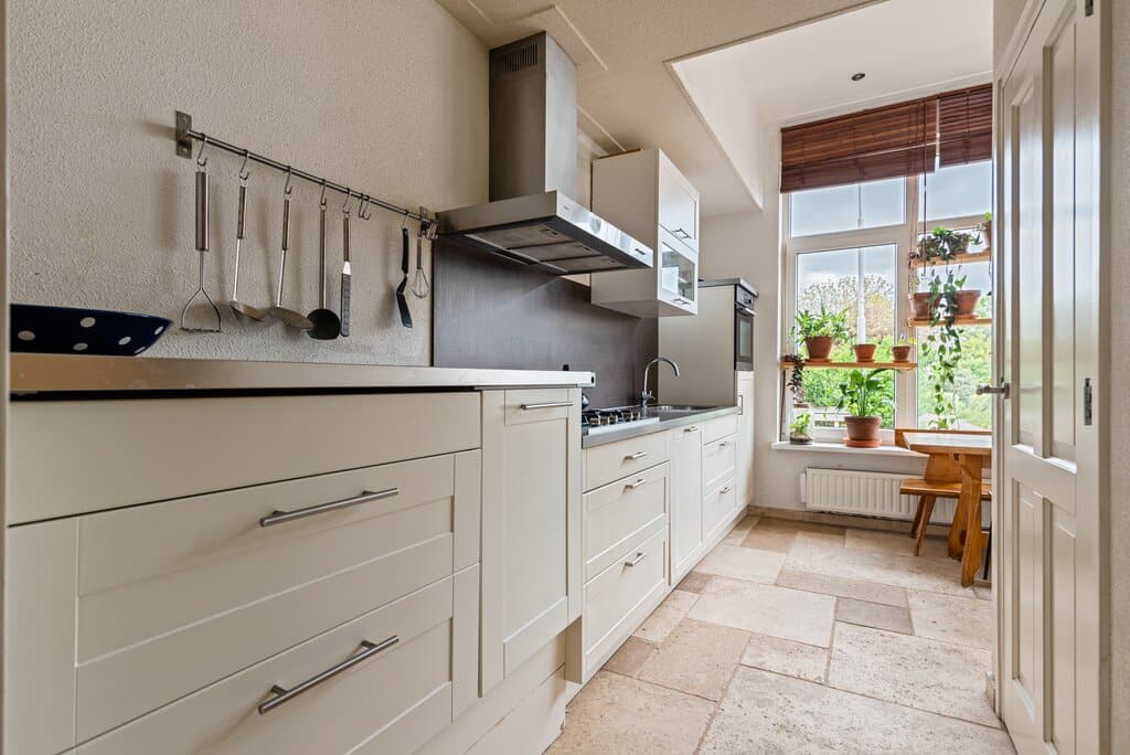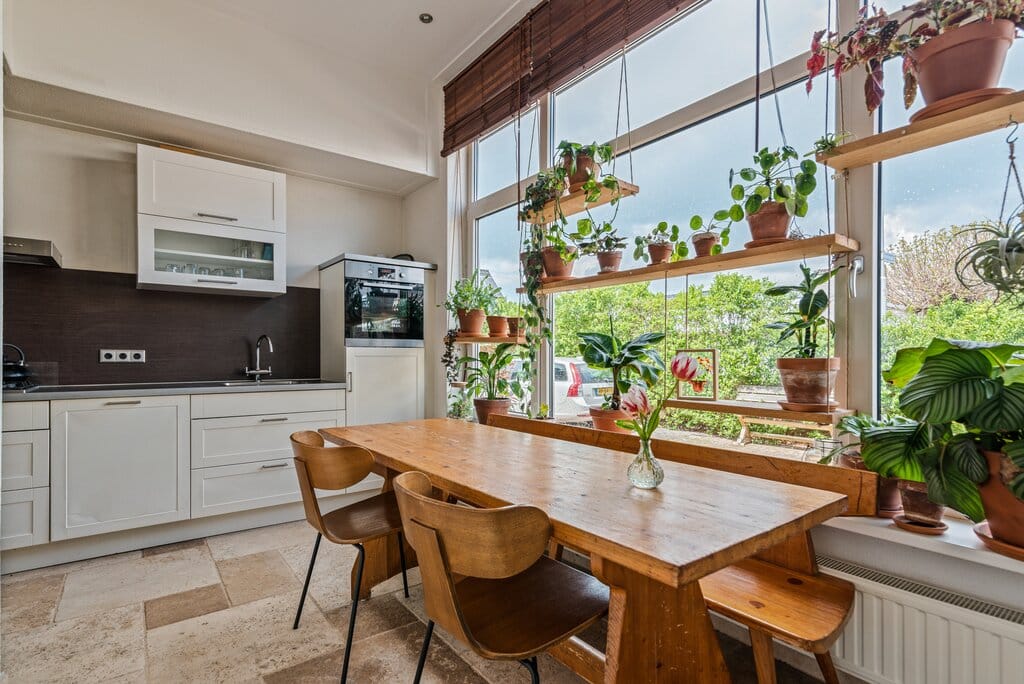 Via een deur glas in lood elementen lopen we de sfeervolle woonkeuken in. Door de speelse L-vorm van deze ruimte in combinatie met de grote raampartijen zijn hier veel mogelijkheden om geheel naar eigen wens in te richten. Er is voldoende ruimte om naast de keuken een ruime eettafel te plaatsen. De keuken is in een rechte vorm, in een praktische setting en met een neutrale uitstraling opgesteld. Verder ingericht met een 5 pits gasfornuis met afzuigkap, combi oven, vaatwasser, koelkast en spoelbak. Boven- en onderkasten zorgen voor voldoende bergruimte. En daarnaast zijn er in de keuken nog een trapkast en extra inbouwkast aanwezig.