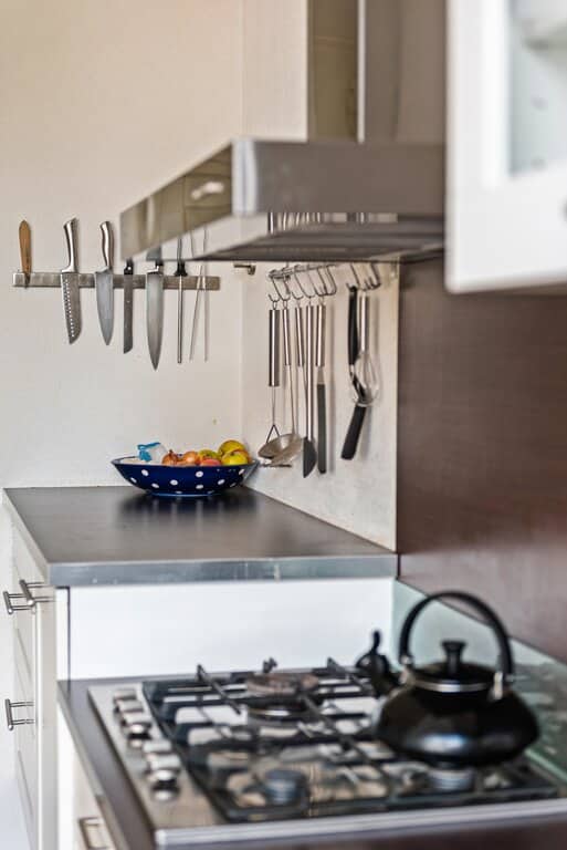 Een leuk detail is het hoogteverschil in het kunststof werkblad wat de speelse indeling doortrekt in de gehele keuken.