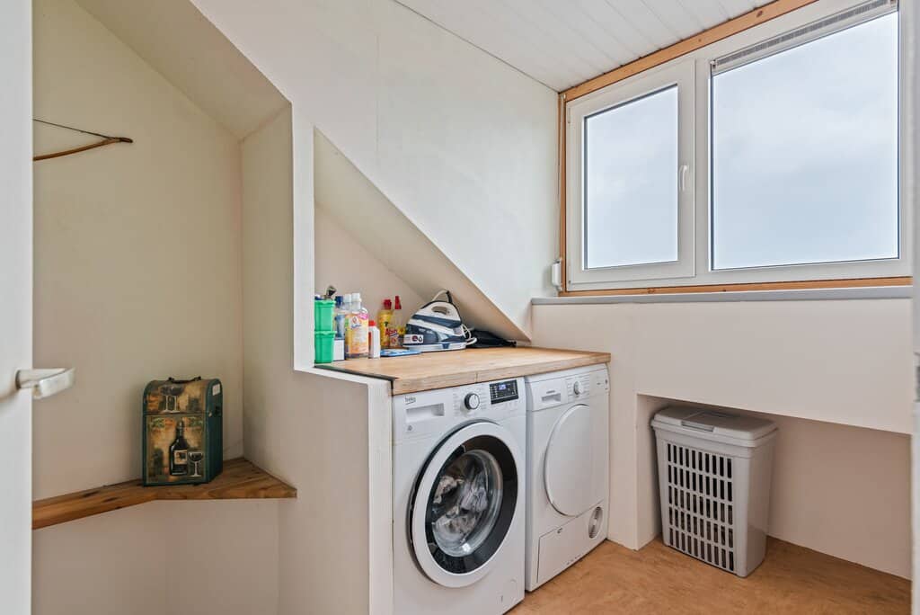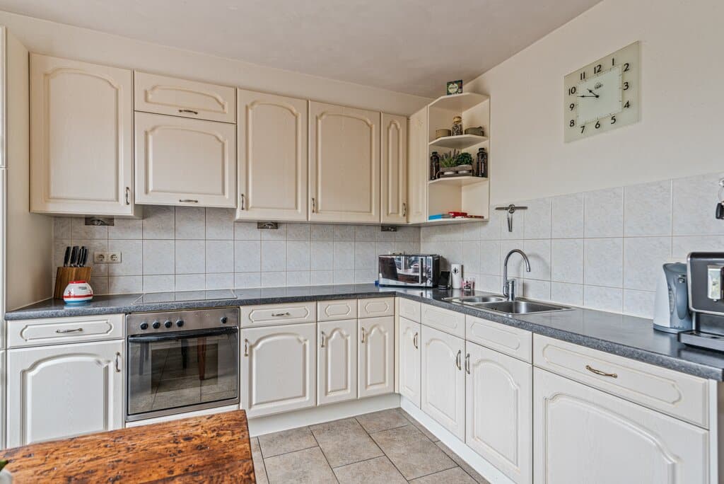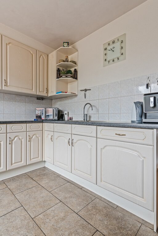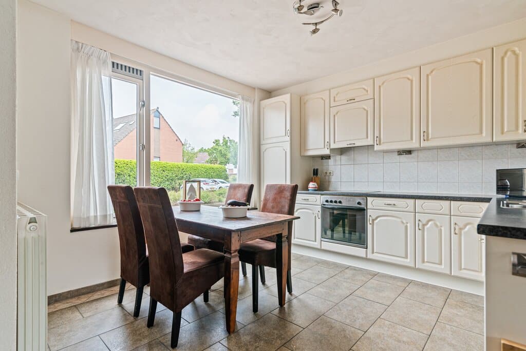 De keuken is aan de voorzijde gelegen en biedt een vrij uitzicht over de voortuin en het verkeersluwe woonerf. De keuken is praktisch in een L-vorm gerealiseerd waardoor er veel werkruimte ontstaat. De keuken is als een zogenaamde “woonkeuken” opgesteld en afgewerkt met lichte kleurstellingen en een donker kunststof blad. In de keuken is er voldoende bewegingsruimte en is de nodige apparatuur aanwezig. Denk aan een 4 pits keramische kookplaat, oven, vaatwasser, koelkast en spoelbak. Verder is er voldoende kastruimte aanwezig. Leuk detail is de lichte wandbetegeling.