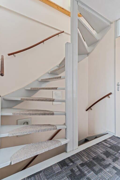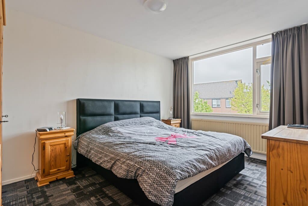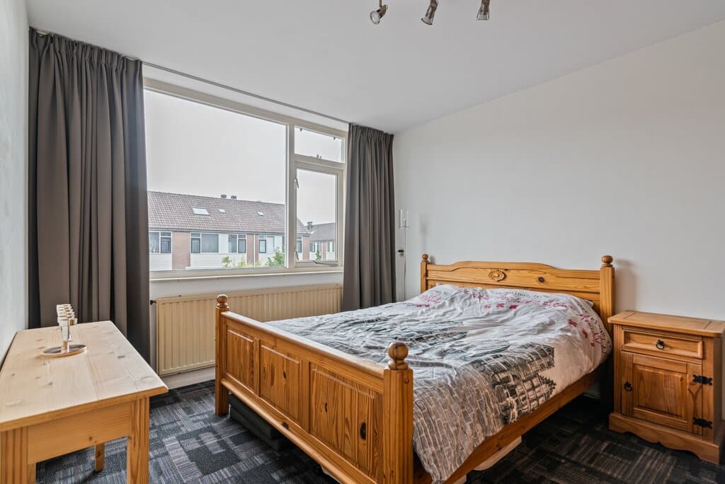 Middels een tussenhal op de begane grond, waar zich tevens het toilet bevindt, gaan we via de vaste trap naar de eerste verdieping. Ook hier zien we weer de ruimtelijkheid die deze woning te bieden heeft. Op de verdieping vinden we drie slaapkamers, badkamer en een vaste trap naar de bovenste verdieping. Een slaapkamer ligt aan de achterzijde en twee aan de voorzijde. Alle kamers zijn ruim opgesteld en bieden voldoende ruimte voor een bed (kleding)kast. Tevens mogelijkheden om de kleinste kamer te gebruiken als werk/kantoorruimte. De verdieping is afgewerkt met een donkergekleurde vloerbedekking en grote raampartijen met gedeeltelijk dubbele beglazing.