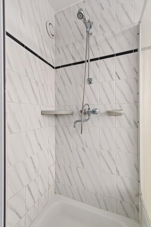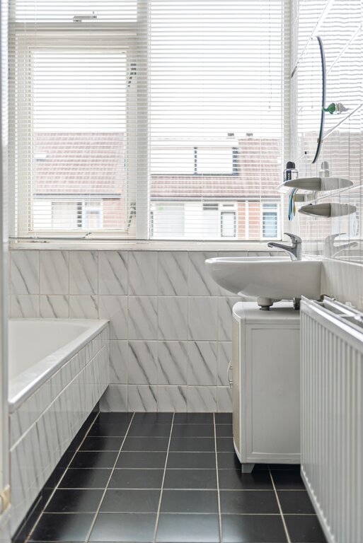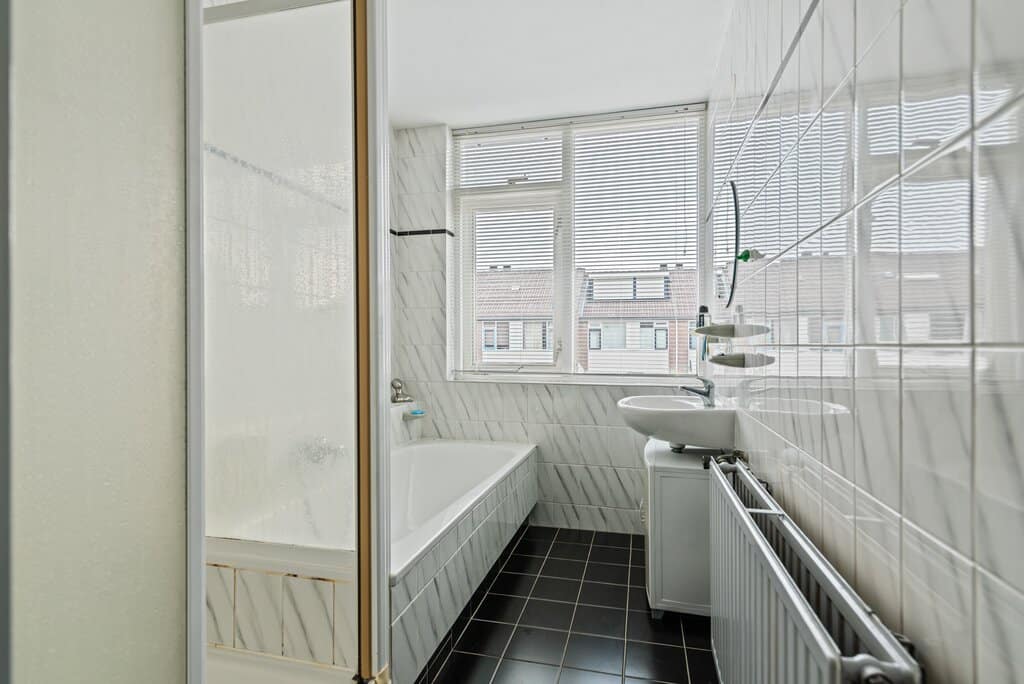 Een praktische badkamer met een ontspannen uitstraling. De badkamer bezit alles wat het nodig heeft. Een ligbad met handdouche, douchecabine en wasmeubel met wastafel. Verder volledig betegeld met zwart en wit tegelwerk en afgewerkt met een gespoten plafond. Natuurlijke ventilatie middels een raam die tevens zorgt voor de nodige lichtinval.