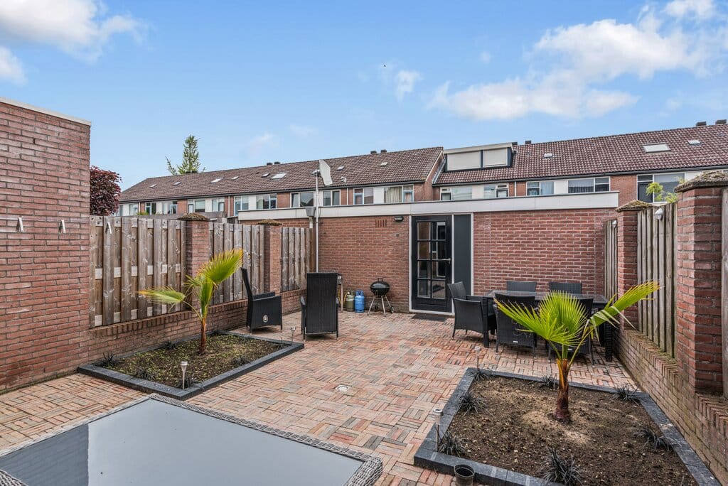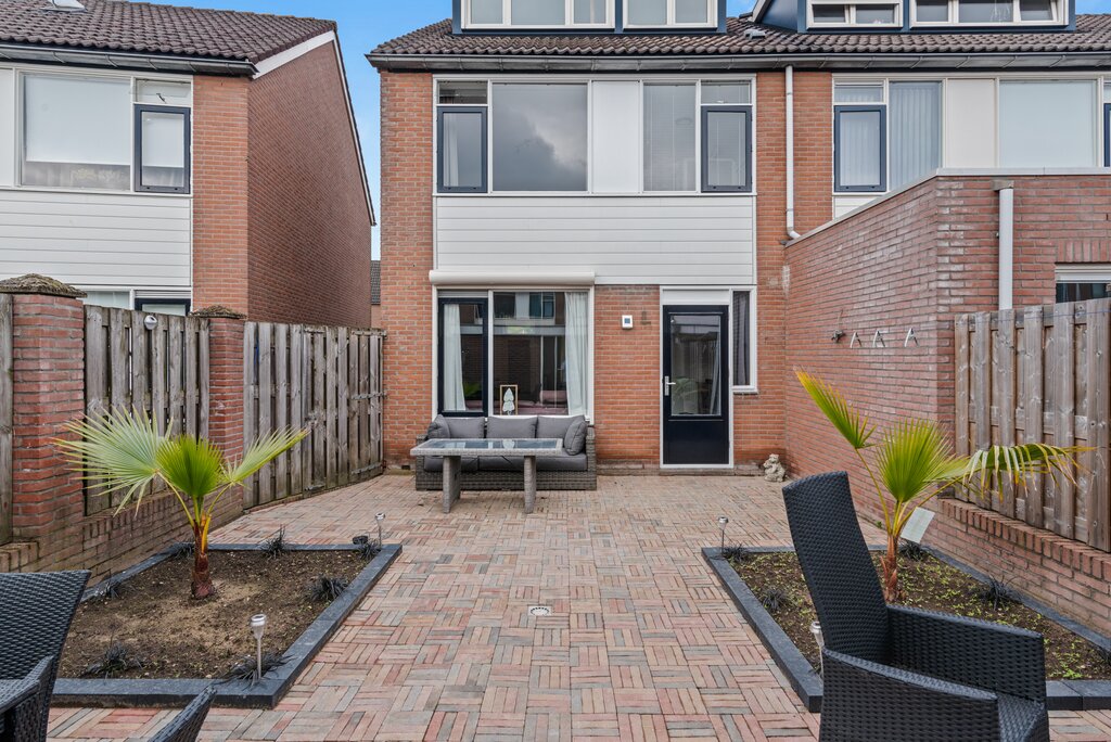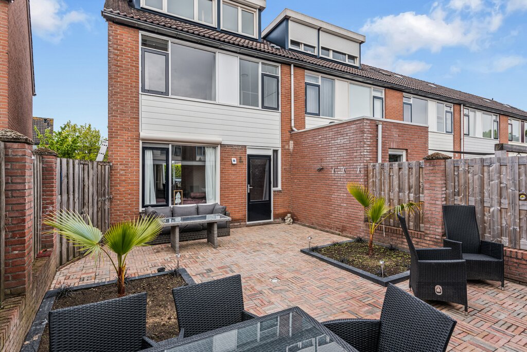De achtergevel is voorzien van veel glas in de gevel en voorzien van een openslaande deur waardoor buiten erg mooi naar binnen gehaald kan worden. Hierdoor ontstaat een heerlijke hiërarchie met de zonnige tuin. De grote raampartijen en diepe achtertuin verhogen het wooncomfort.
