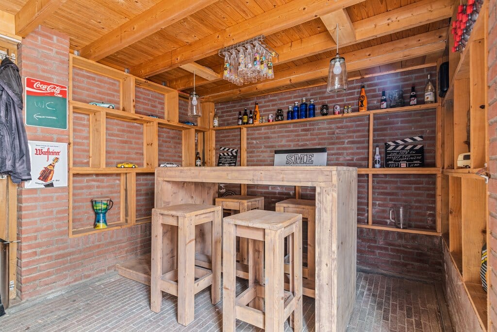 De lichte, speelse tegelvloer met band en hoog plintwerk die drempelloos is gelegd, gespachtelde wanden, schuurplafond, rolluiken en grote raampartijen met dubbel glas verzorgen deze eenheid.
