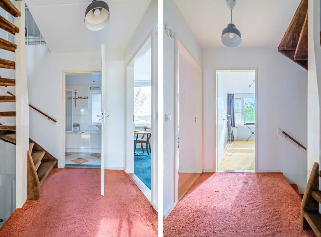 Op de verdieping vervolgen we het nette onderhoud en de verrassingen van deze tweekapper. De overloop vormt hier het hart van de verdieping en biedt toegang tot alle ruimtes. Over de gehele verdieping, exclusief de badkamer en master bedroom vinden we vloerbedekking. De master bedroom aan de achterzijde is voorzien van vinyl.