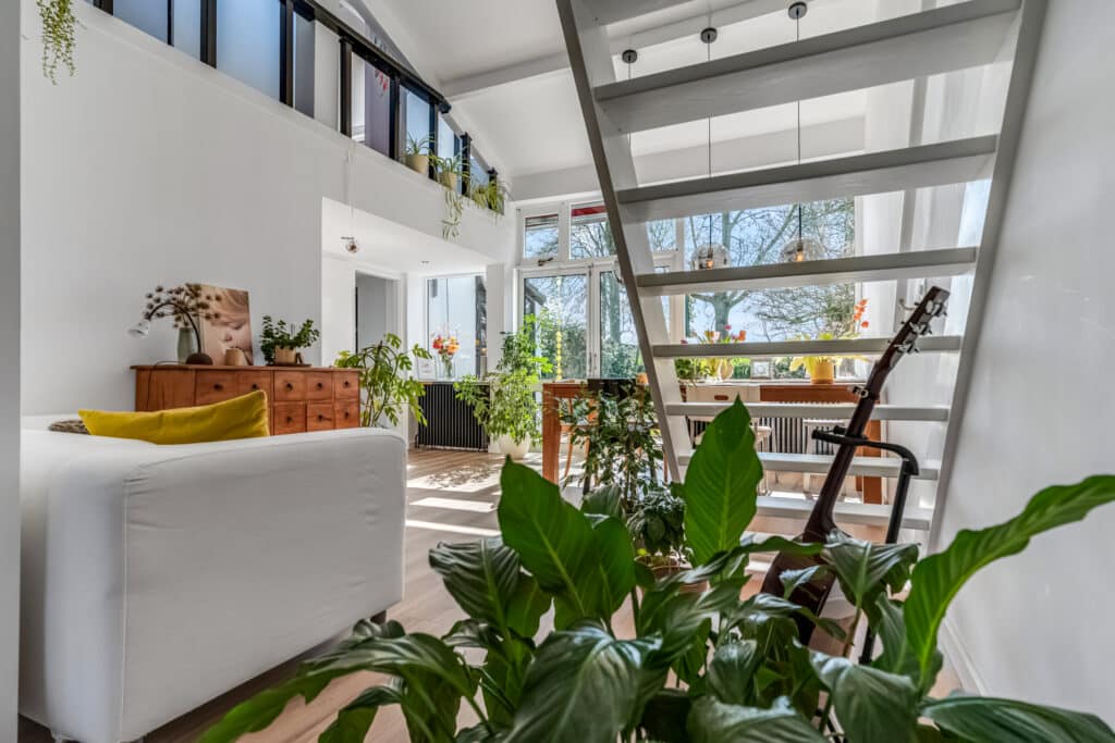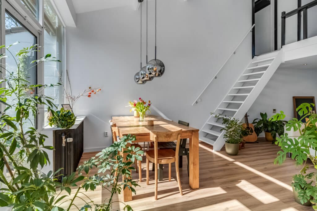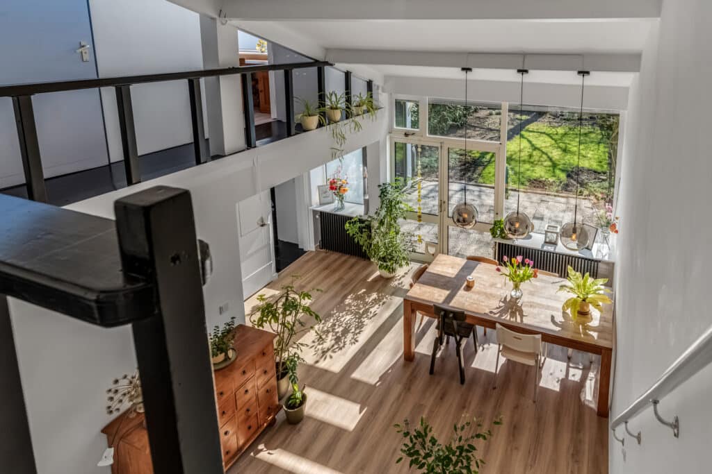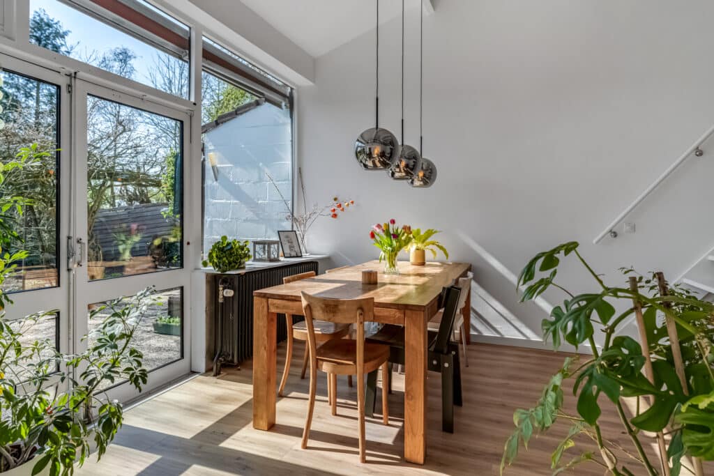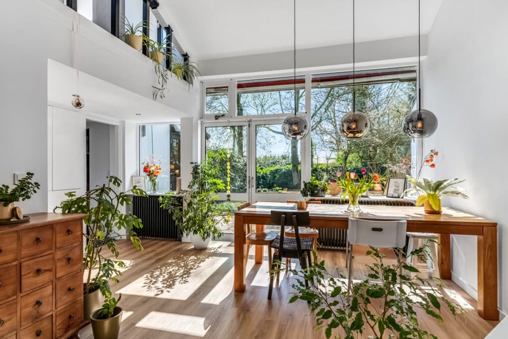 Bij binnenkomst via de hal met toilet kom je uit in de sfeervolle eetkamer – het hart van het huis. Hier valt direct de ruimtelijkheid op: de hoge plafonds en de volledig glazen pui met openslaande deuren zorgen voor een zee aan licht en een prachtige verbinding met de tuin. Het is een plek waar je moeiteloos een grote eettafel kwijt kunt en die uitnodigt tot lange avonden tafelen met vrienden of juist een fijn gezinsdiner. De speelse indeling maakt de woning écht bijzonder. Een klein trappetje leidt naar de zitkamer aan de voorzijde, waar de gezellige houtkachel en de vele raampartijen zorgen voor warmte, sfeer en een fijne plek om te ontspannen.