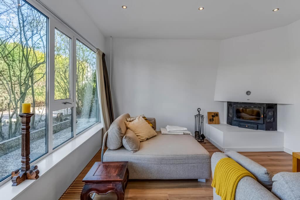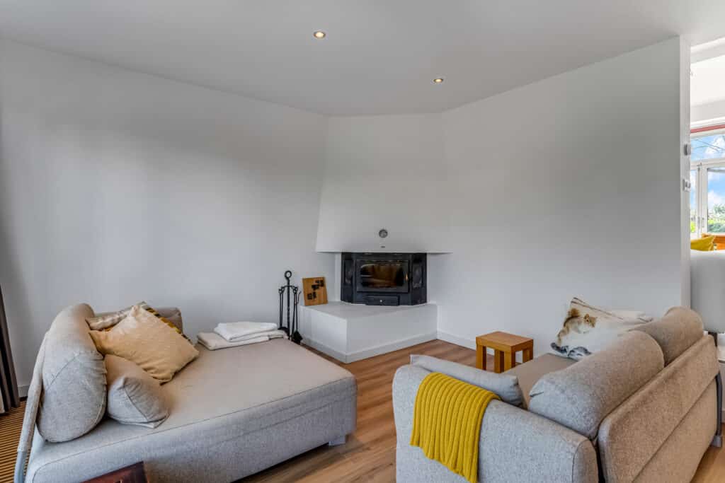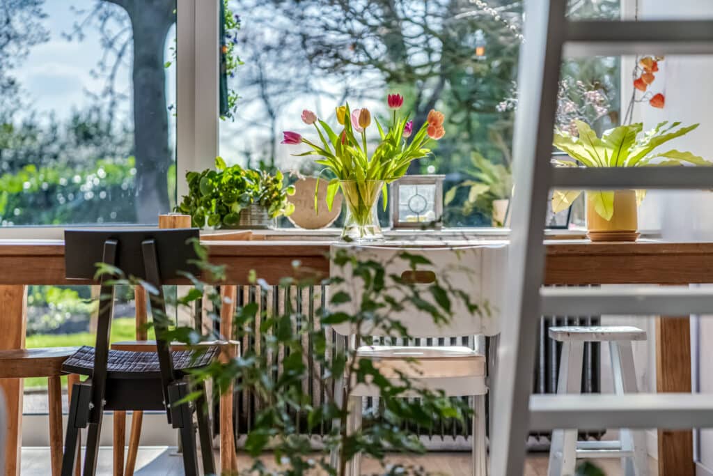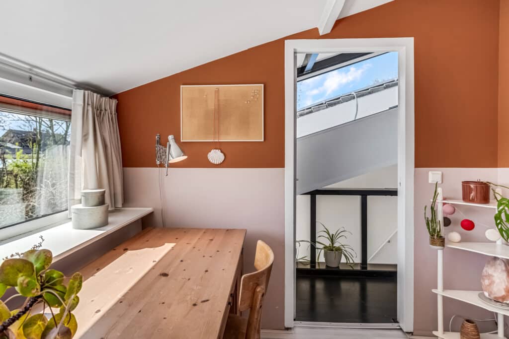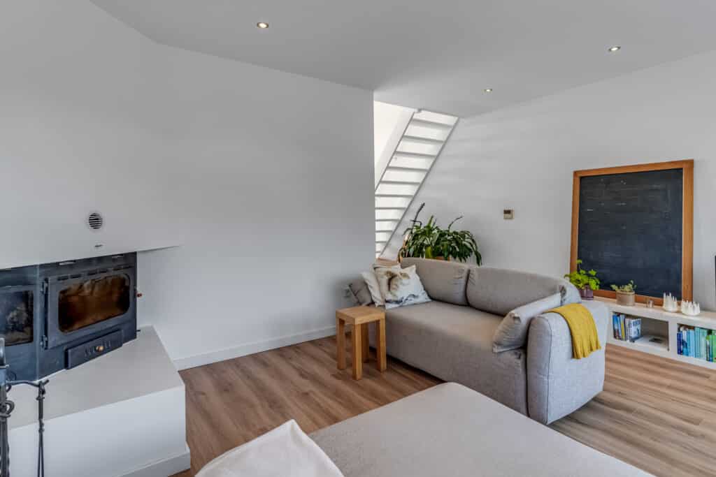 Bij binnenkomst via de hal met toilet kom je uit in de sfeervolle eetkamer – het hart van het huis. Hier valt direct de ruimtelijkheid op: de hoge plafonds en de volledig glazen pui met openslaande deuren zorgen voor een zee aan licht en een prachtige verbinding met de tuin. Het is een plek waar je moeiteloos een grote eettafel kwijt kunt en die uitnodigt tot lange avonden tafelen met vrienden of juist een fijn gezinsdiner. De speelse indeling maakt de woning écht bijzonder. Een klein trappetje leidt naar de zitkamer aan de voorzijde, waar de gezellige houtkachel en de vele raampartijen zorgen voor warmte, sfeer en een fijne plek om te ontspannen.