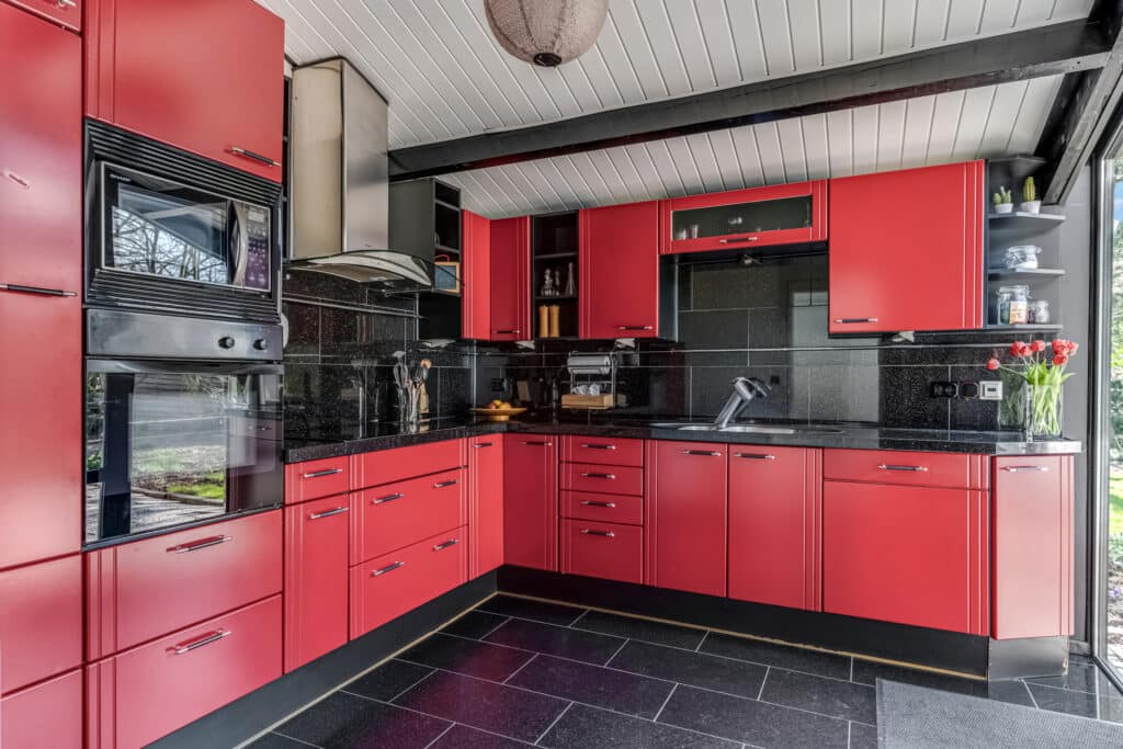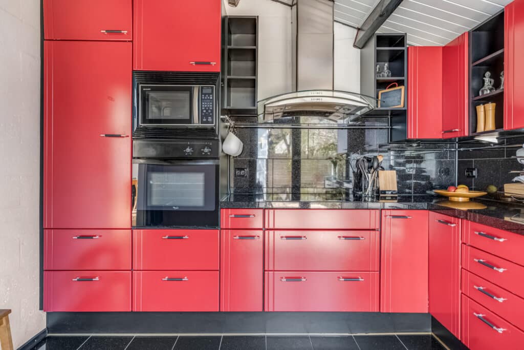 Aan de andere zijde van de eetkamer bevindt zich de keuken met aangrenzende bijkeuken. De keuken is royaal opgezet in een praktische L-vorm en uitgevoerd in warme rode tinten, gecombineerd met een chic donker granieten blad en fraaie wandbetegeling. Hier geniet je van een ruime werk- en kookomgeving, voorzien van uitgebreide inbouwapparatuur zoals een inductiekookplaat met afzuigkap, vaatwasser, koelkast, separate oven en magnetron. Ook aan kastruimte geen gebrek: zowel boven als onder vind je volop opbergruimte, waardoor alles netjes en overzichtelijk blijft.