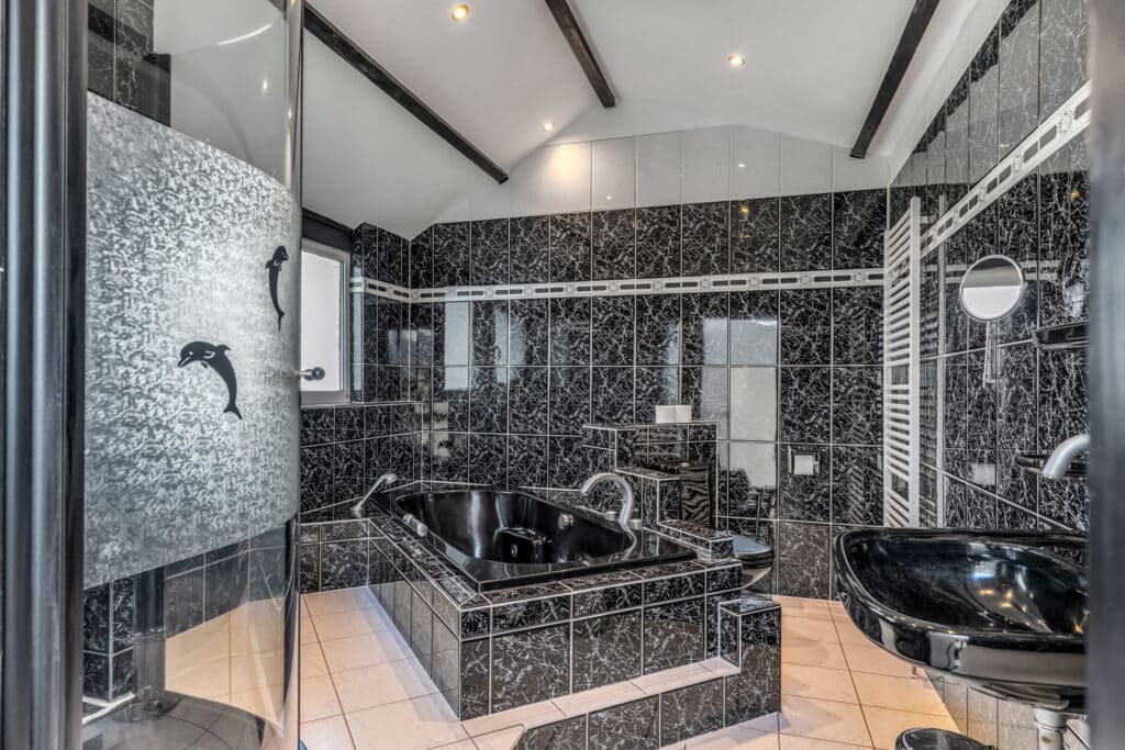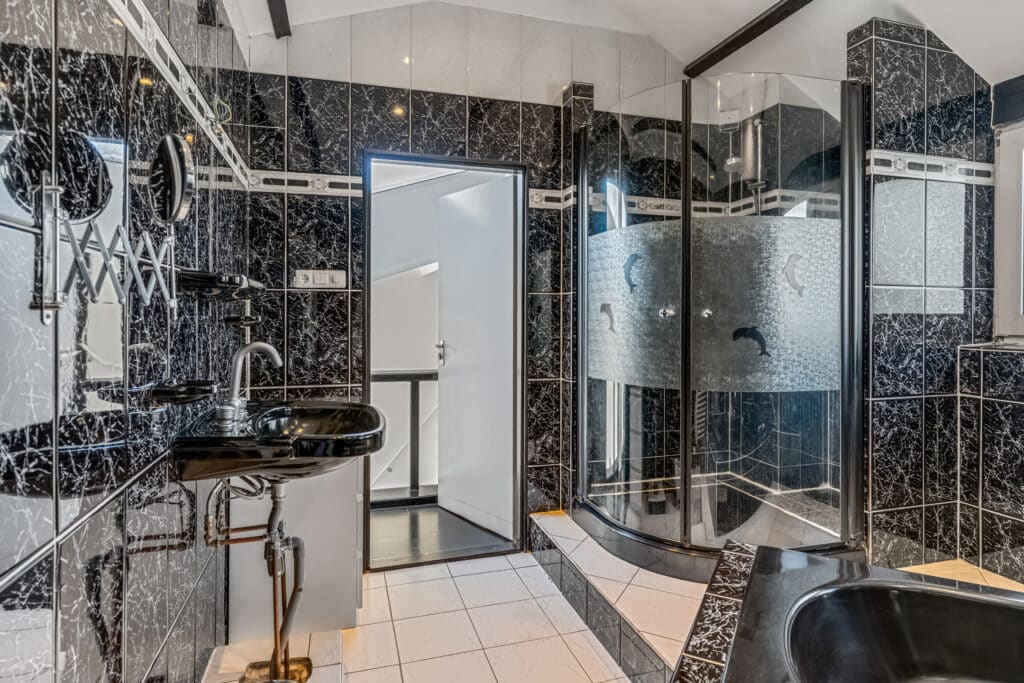 De badkamer is royaal van opzet en biedt alles wat je nodig hebt: een riante douchecabine, een verlaagd ligbad met whirlpool, wastafel, toilet en designradiator. Helemaal compleet en klaar voor dagelijks comfort.