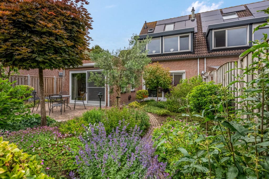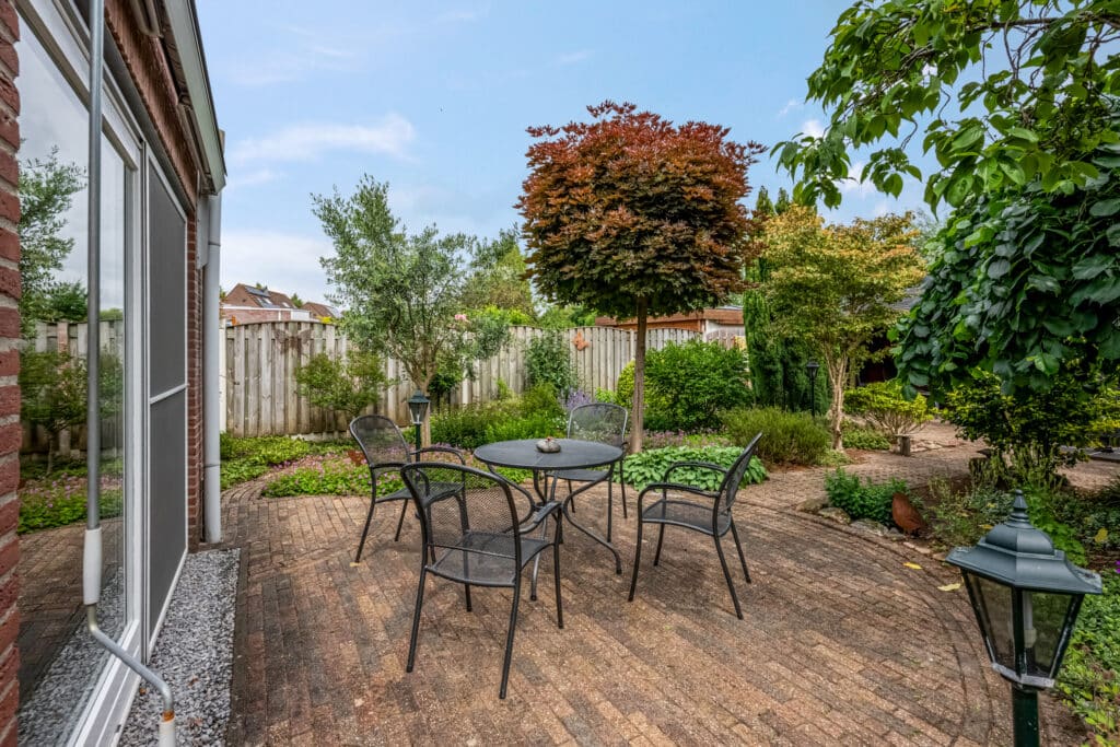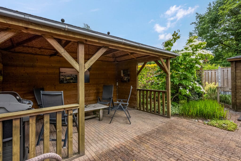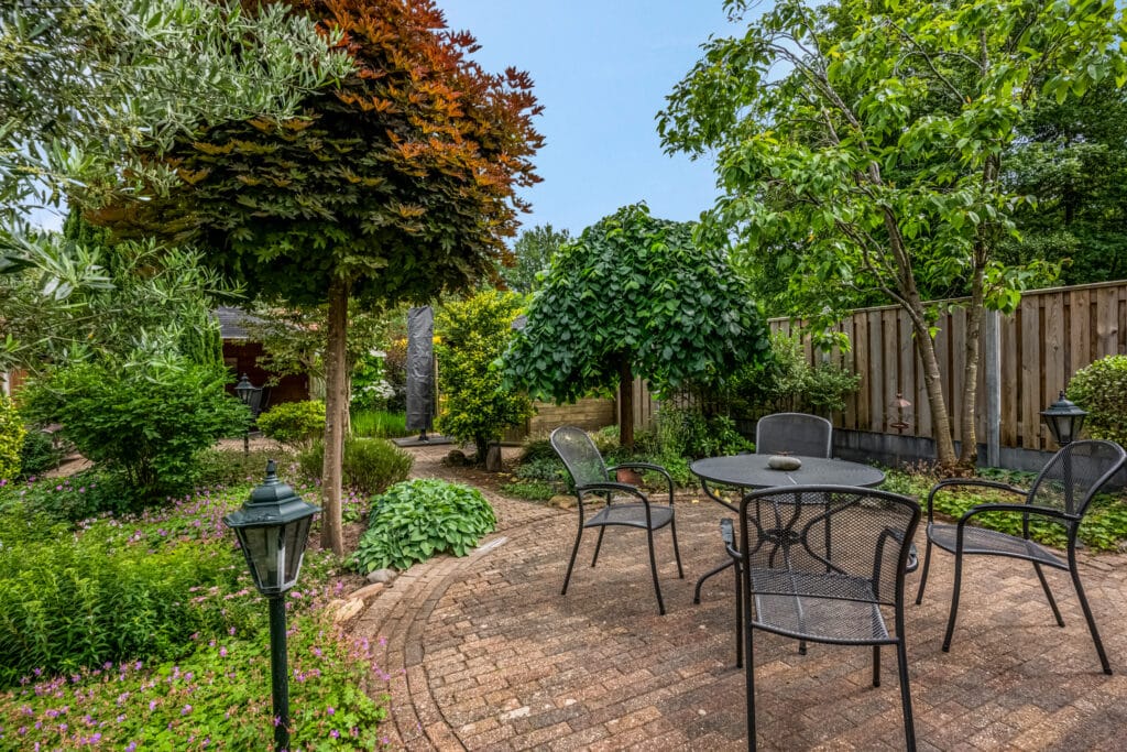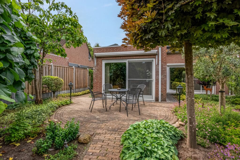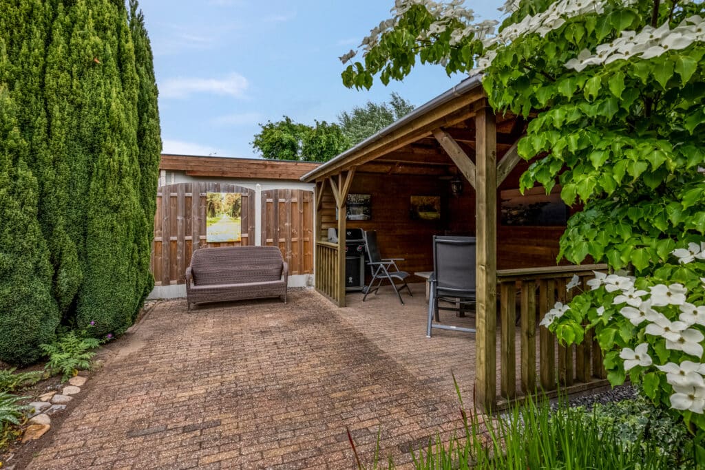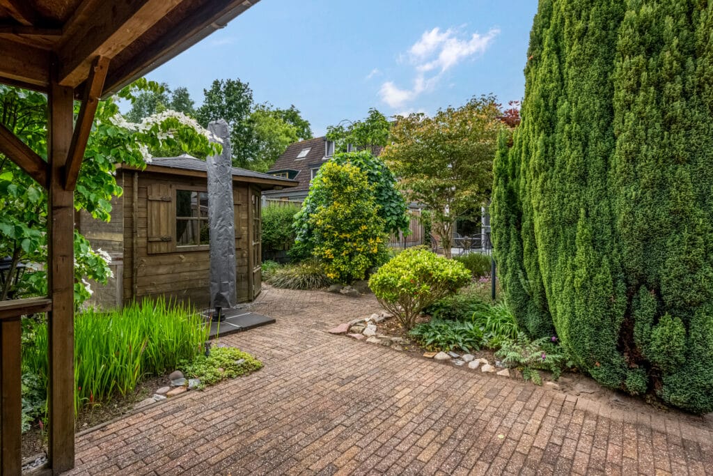 Wat een heerlijke plek! De parkachtige tuin is met zorg ontworpen en biedt de perfecte mix van groen, bestrating en terrassen. Zowel bij de woonkamer als eetkamer zijn zonneschermen geplaatst. In het midden van de tuin bevindt zich een gezellig terras, met daarachter een houten tuinhuis en een veranda/overkapping waar je heerlijk van de avondzon kunt genieten.
