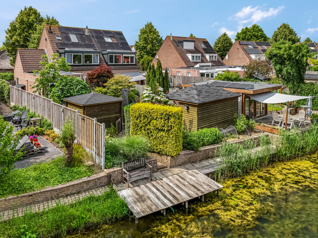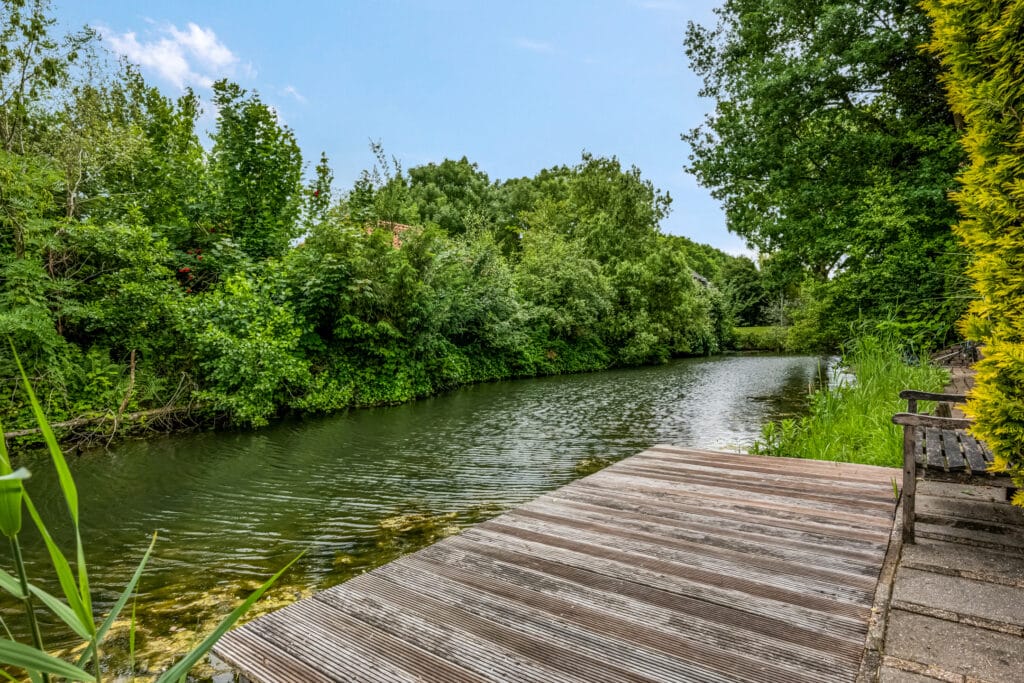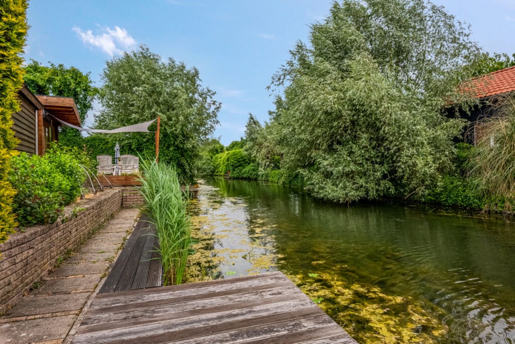 Helemaal achterin ligt de vlonder aan het water – een idyllische plek om te ontspannen, te lezen of gewoon te genieten van de rust en het uitzicht.