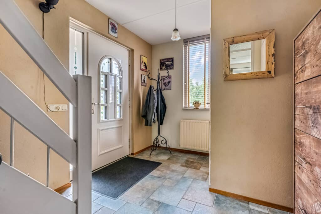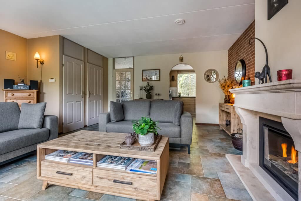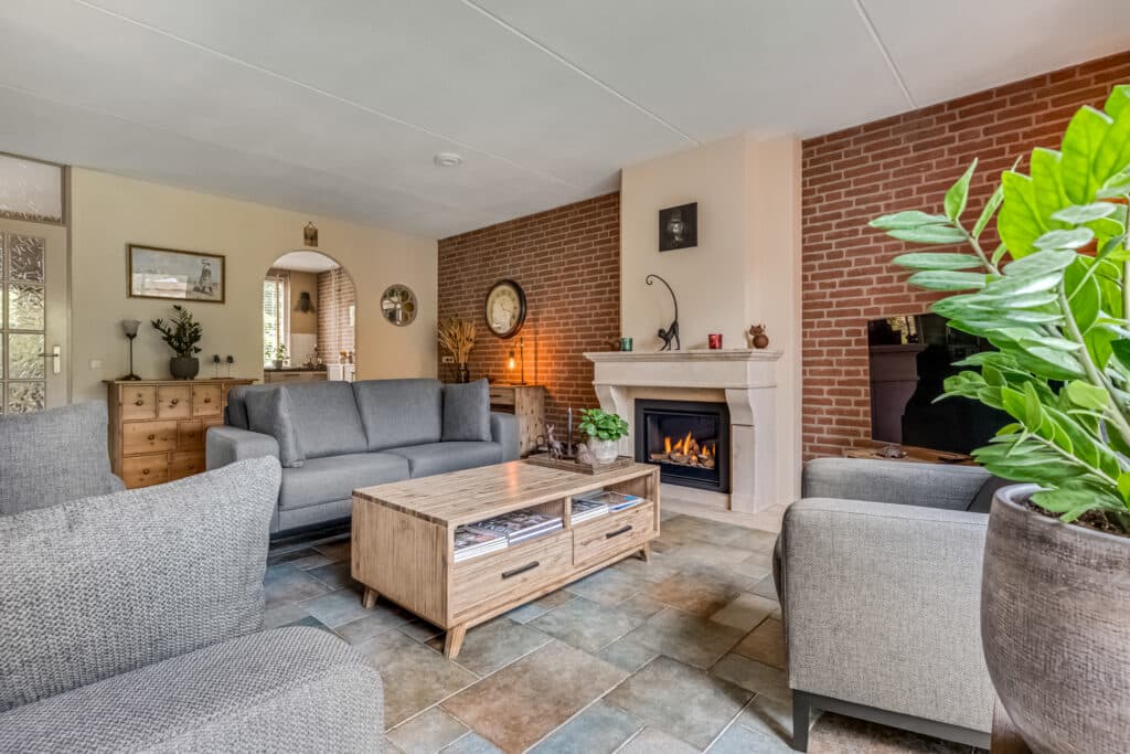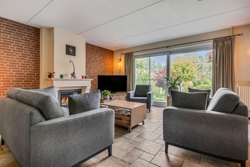 Bij binnenkomst valt meteen de royale hal op met zijn mooie tegelvloer en nette afwerking. Vanuit hier bereik je het toilet, de meterkast (vernieuwd in 2022 met 3-fase aansluiting) en de trapopgang naar de verdieping. De ruime woonkamer ademt warmte en sfeer dankzij de prachtige gashaard met schouw en de grote glazen pui met schuifdeur naar de tuin. De toog naar de eetkamer zorgt voor een speelse indeling en een heerlijke verbinding tussen wonen en eten.