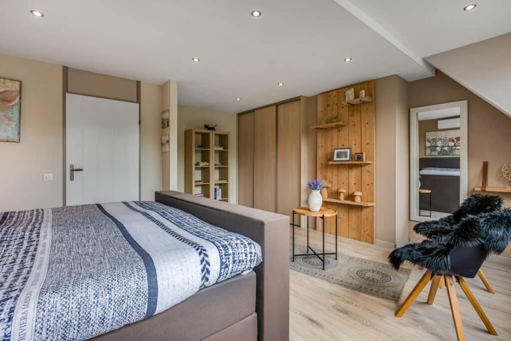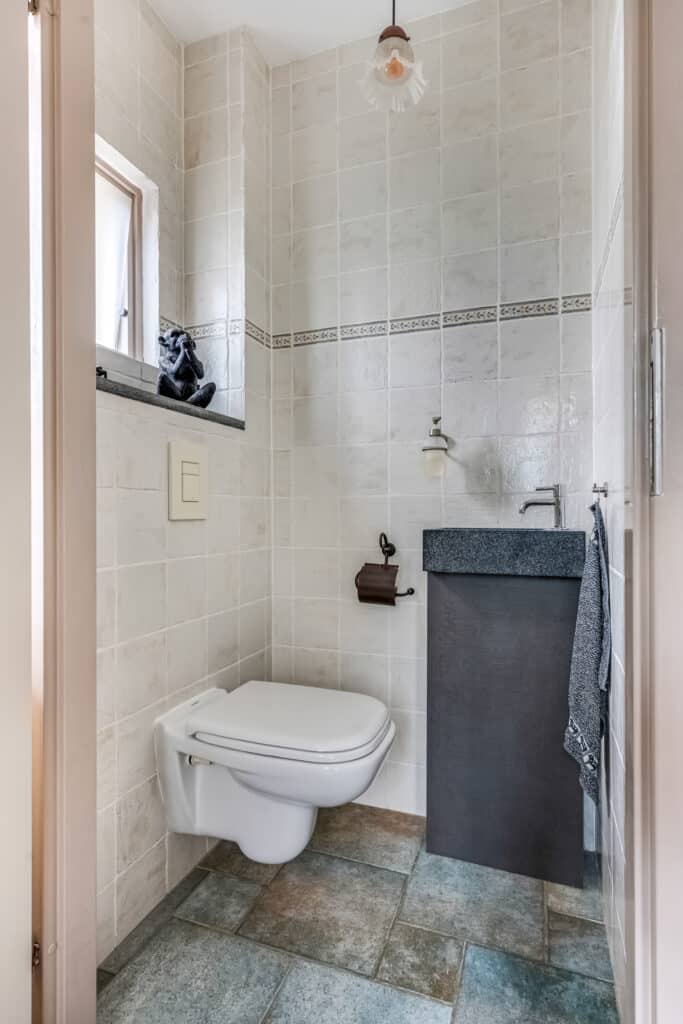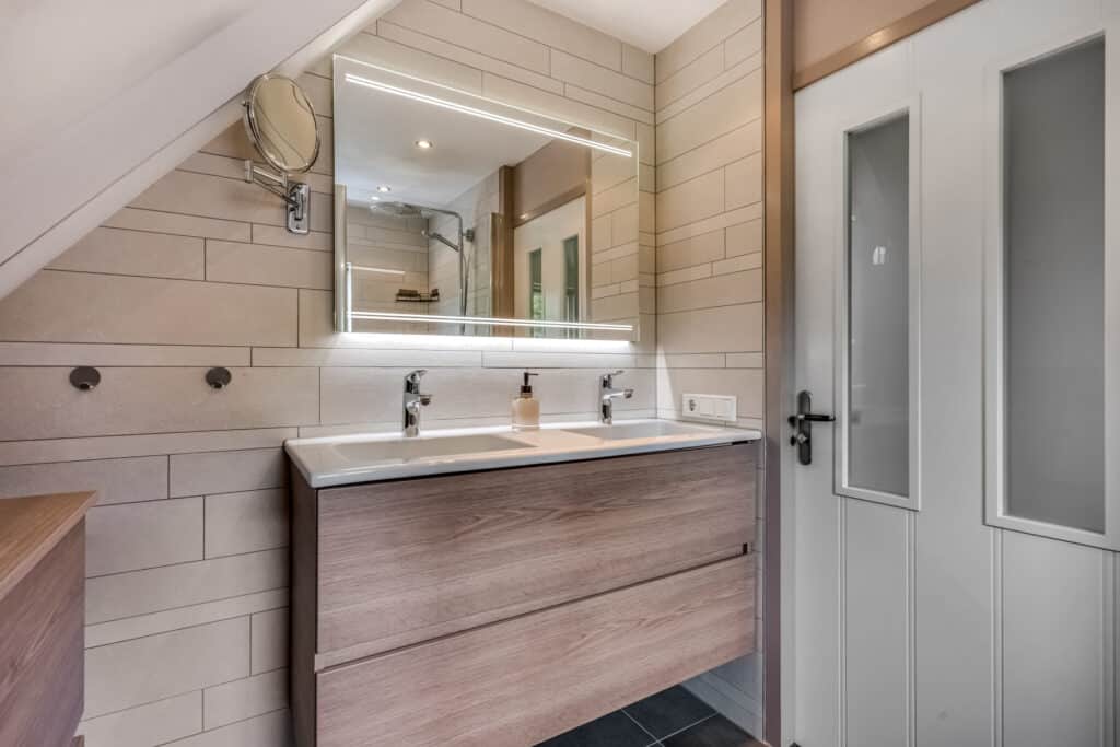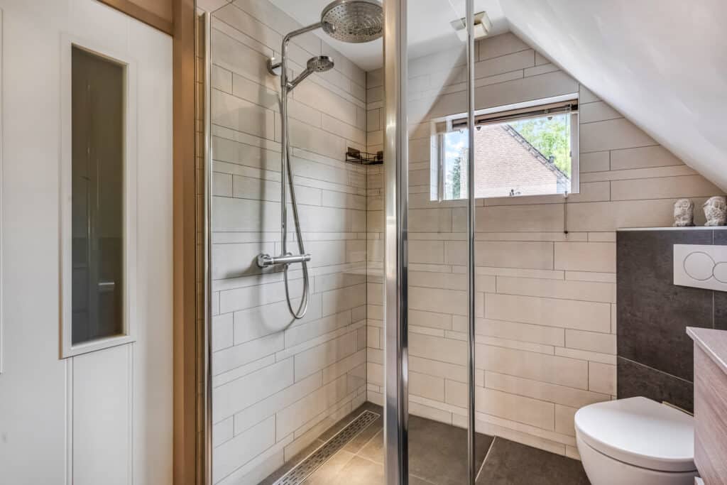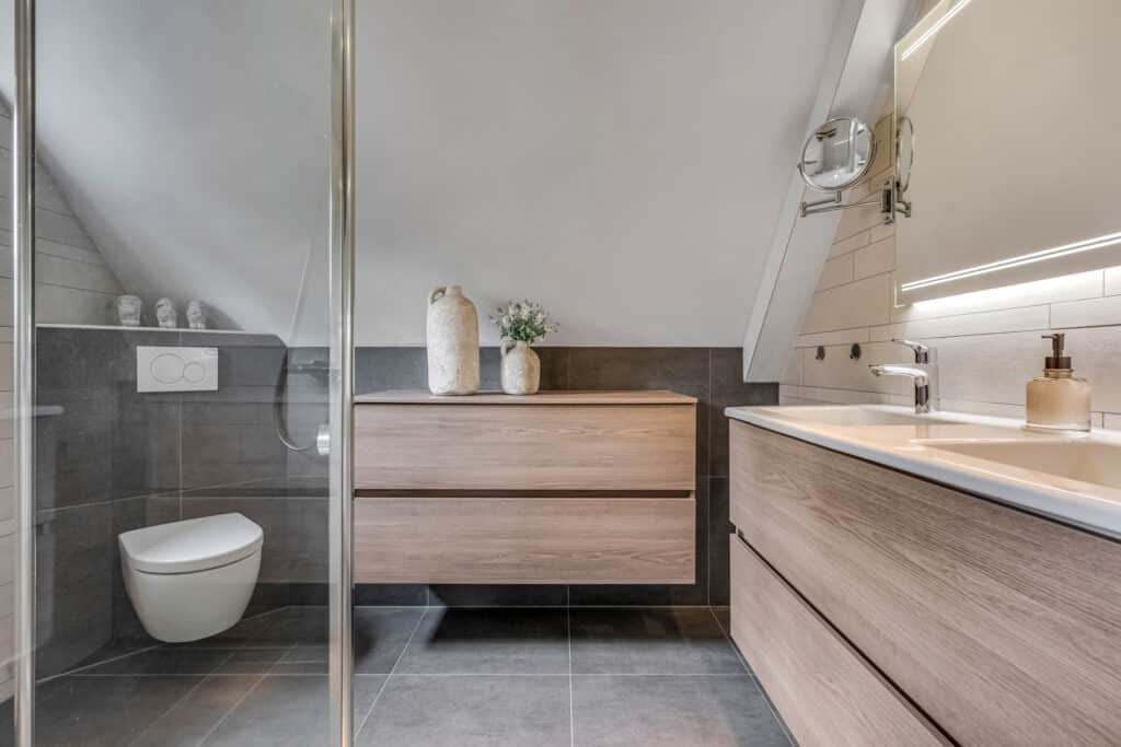 De moderne badkamer is een echte blikvanger: stijlvol betegeld in neutrale tinten, met een luxe inloopdouche met regendouche, dubbele wastafel in houtlook meubel, toilet en extra opbergmeubel. Hier komt ontspanning vanzelf.