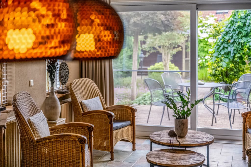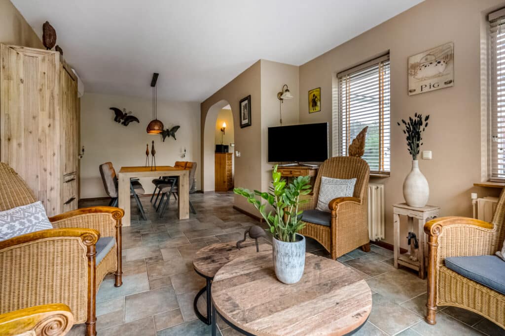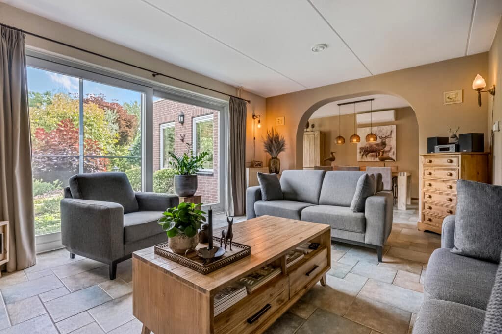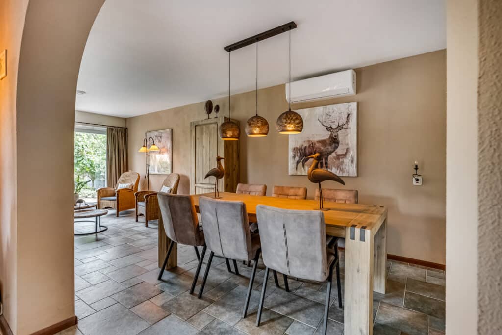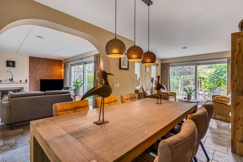 De uitbouw aan de achterzijde (2000) creëert extra leefruimte en maakt van de eetkamer een volwaardige tweede woonkamer, met eveneens een schuifpui richting de tuin. Overal ligt dezelfde kwalitatieve vloer, wat rust en eenheid brengt in het geheel.