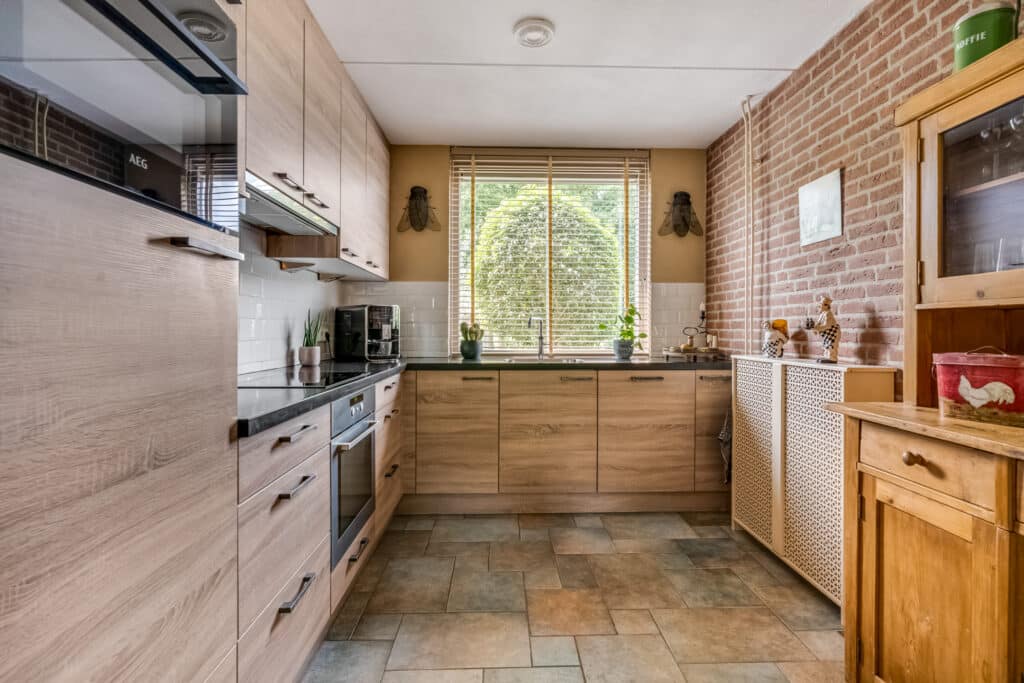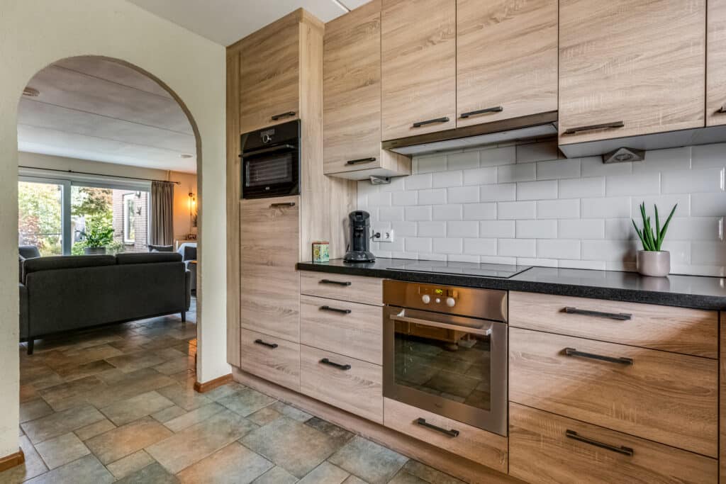 Aan de voorzijde vind je de halfopen keuken in een stijlvolle houtlook met zwarte accenten. De keuken is praktisch en modern ingericht met een donker stenen blad, handgevormde wandtegels, en luxe apparatuur, waaronder een inductiekookplaat met afzuiging, combi-oven, separate oven, Quooker, vaatwasser en spoelbak. Hier kook je met plezier, met volop kastruimte en uitzicht over de gezellige straat.