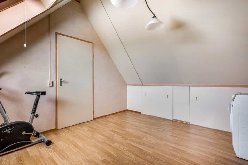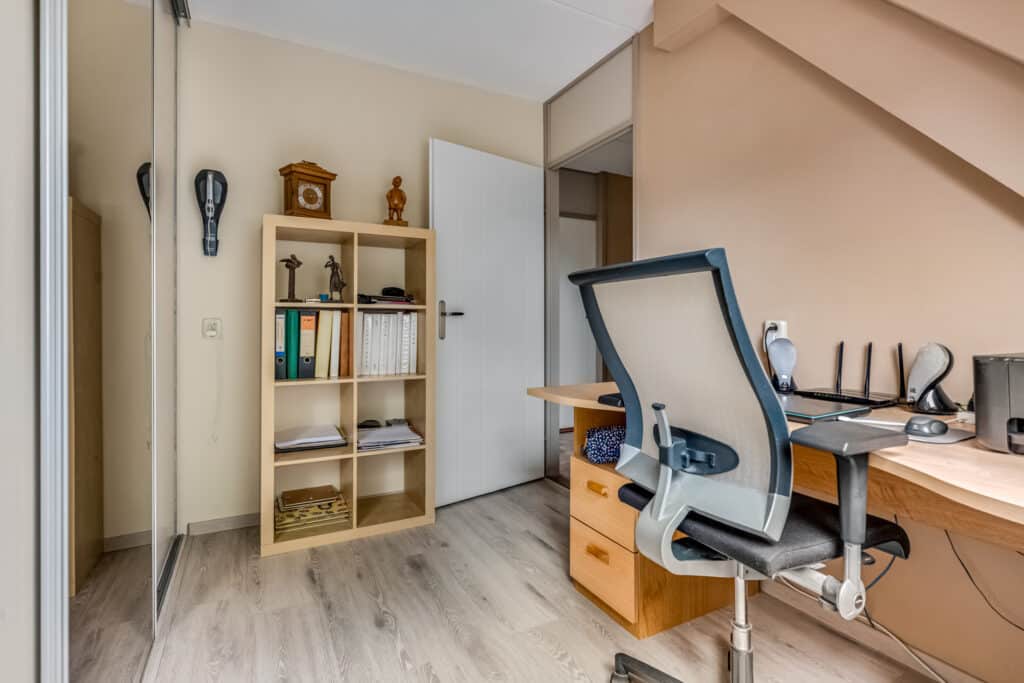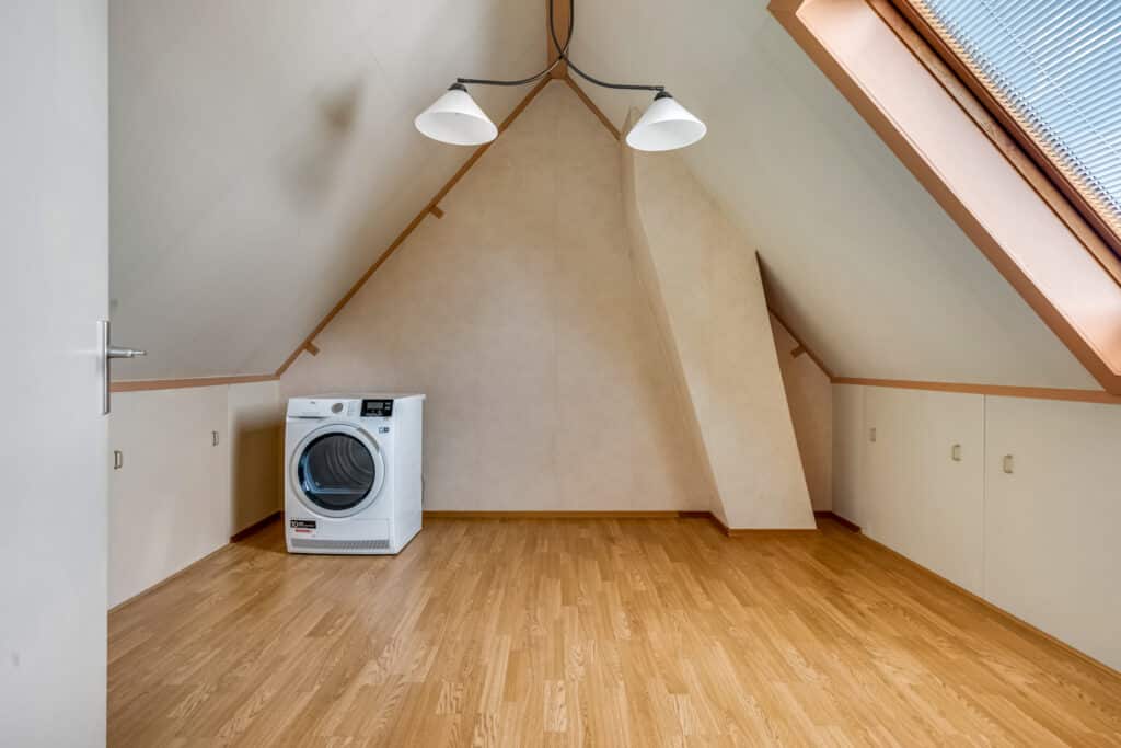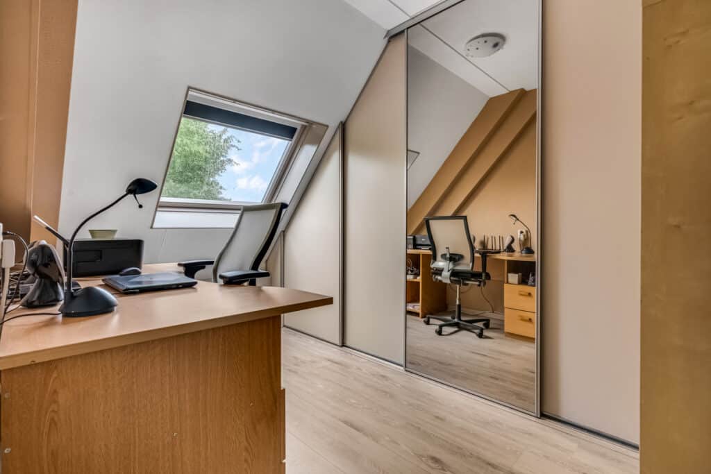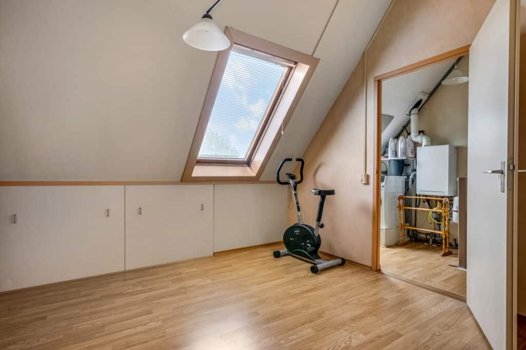 De tweede kamer is ideaal als kinderkamer, kantoor of logeerkamer, met een groot dakraam dat zorgt voor veel licht. De verdieping is volledig afgewerkt met warmkleurig laminaat.