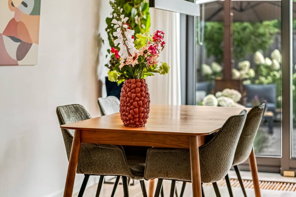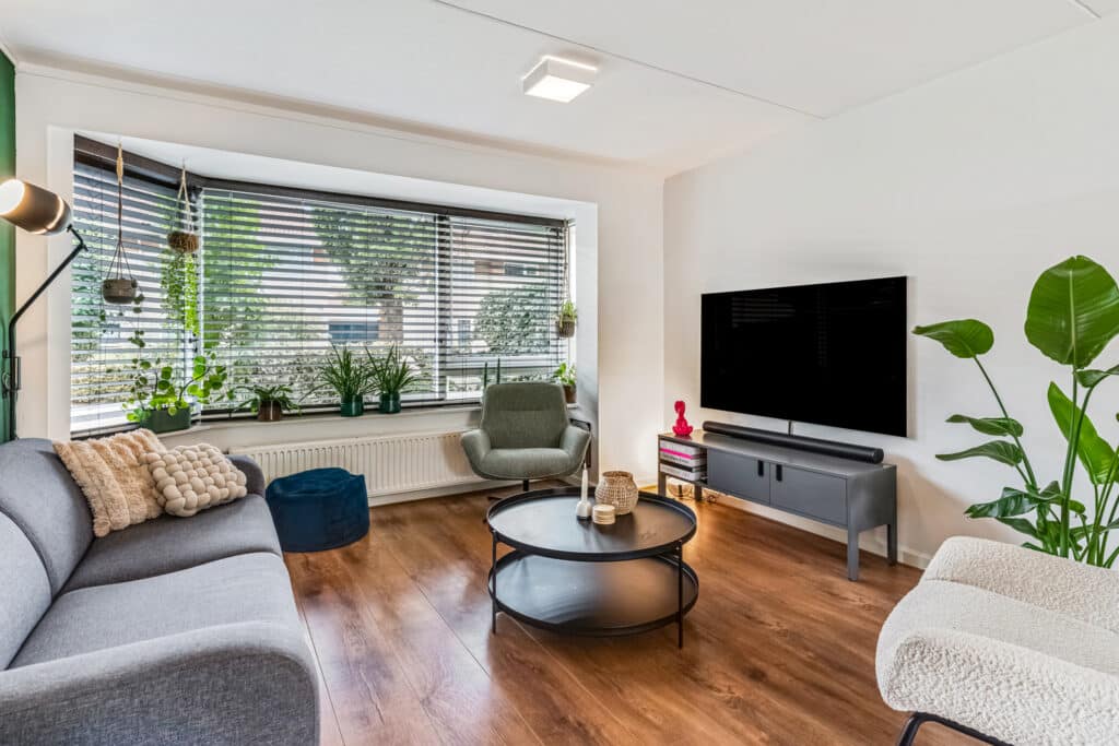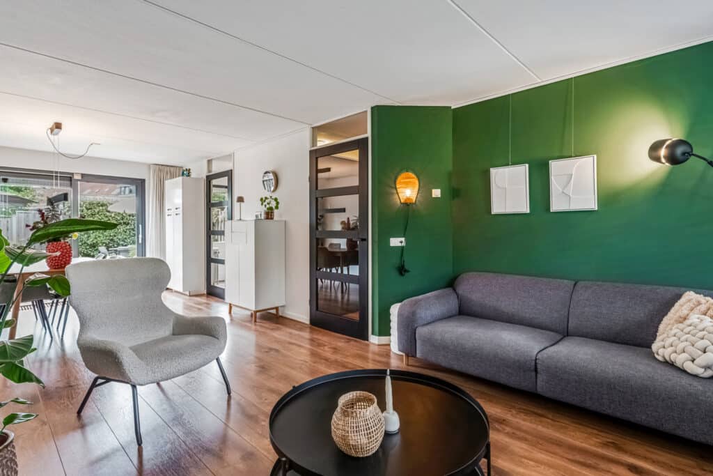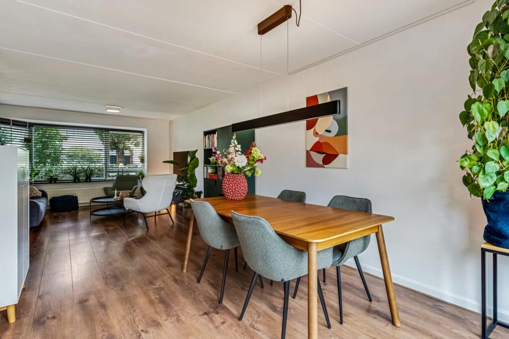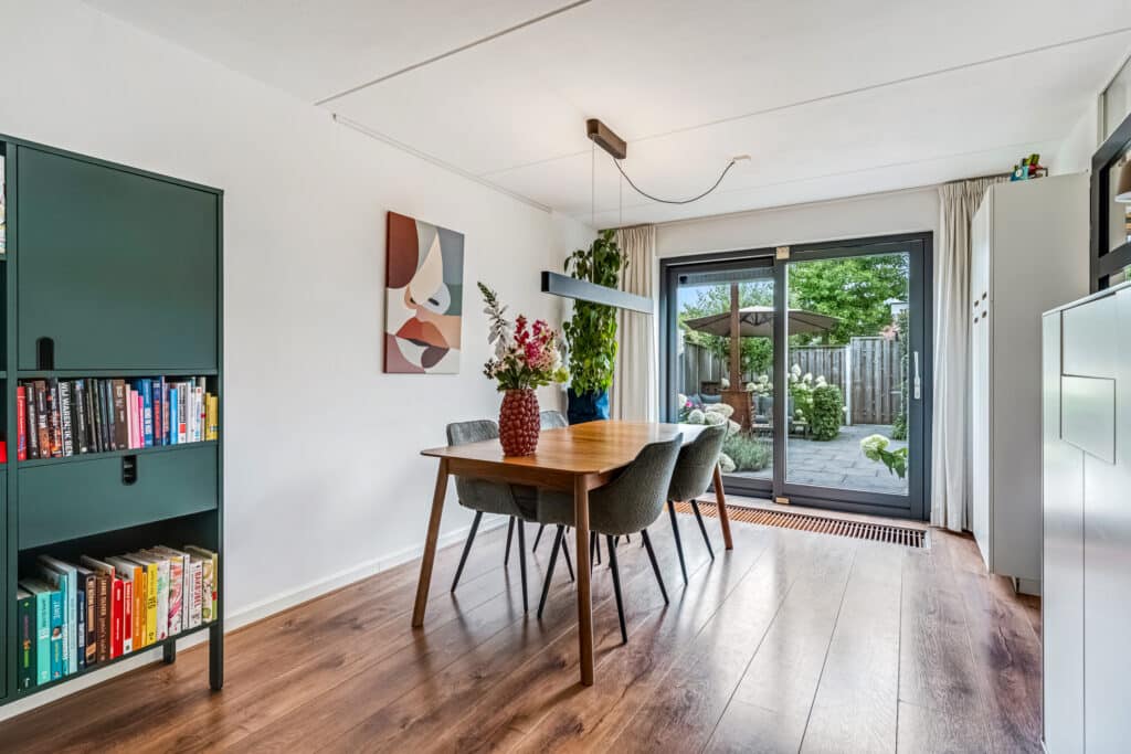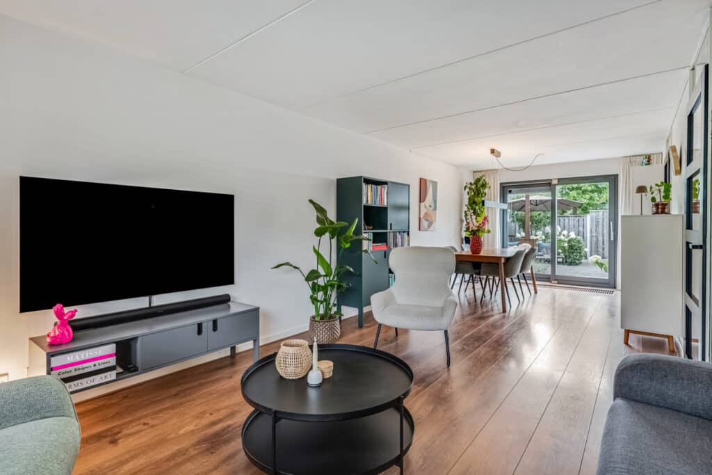 De doorzonwoonkamer is een heerlijke leefruimte waar licht vrij spel heeft. Aan de voorzijde nodigen de grote raampartijen uit tot ontspannen, terwijl aan de achterzijde de schuifpui zorgt voor een prachtige verbinding met de tuin. Hier vloeien binnen en buiten moeiteloos in elkaar over. De ruimte voelt open, licht en warm aan – een plek waar je graag thuiskomt na een lange dag.