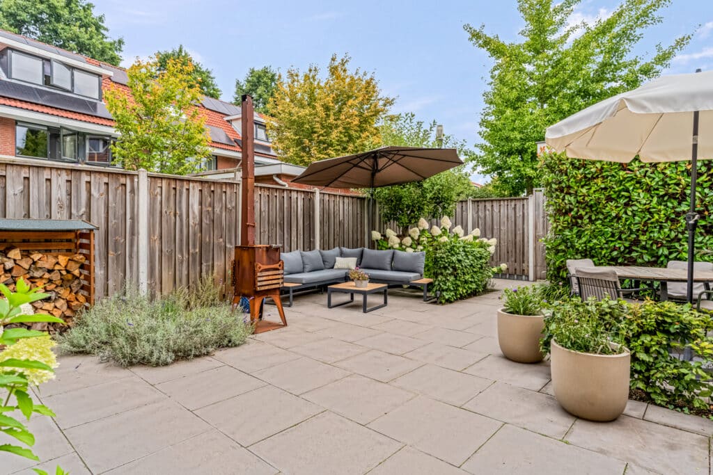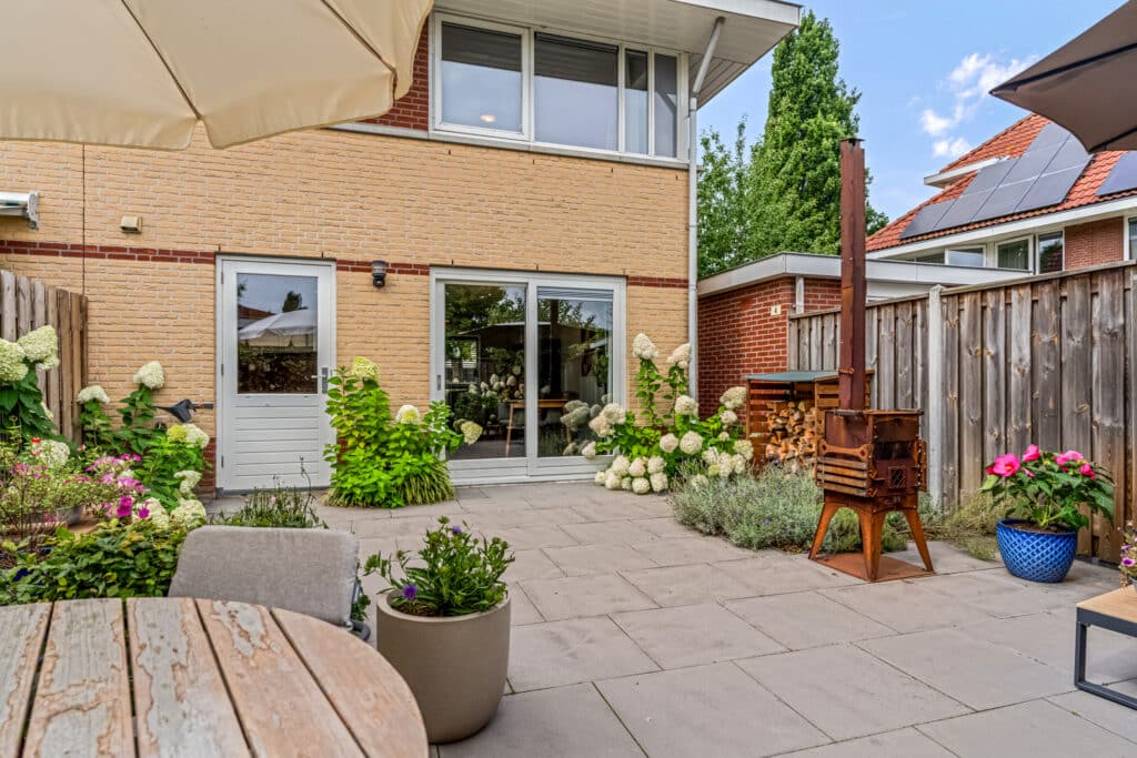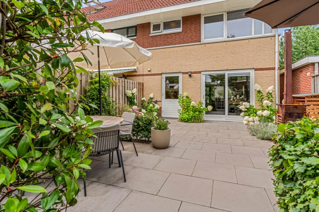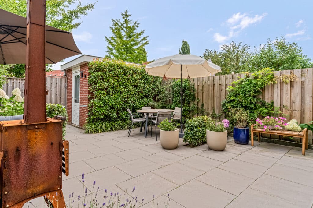 De achtertuin is een fijne mix van groen en bestrating, met grijze terrastegels, borders en meerdere plekken om een terras te creëren. Hier kun je op elk moment van de dag een plekje in de zon of schaduw vinden. Het stenen schuurtje biedt praktische bergruimte en via de achterom is de tuin ook gemakkelijk bereikbaar. Een heerlijke plek om te ontspannen, te spelen of gezellig samen te zijn.