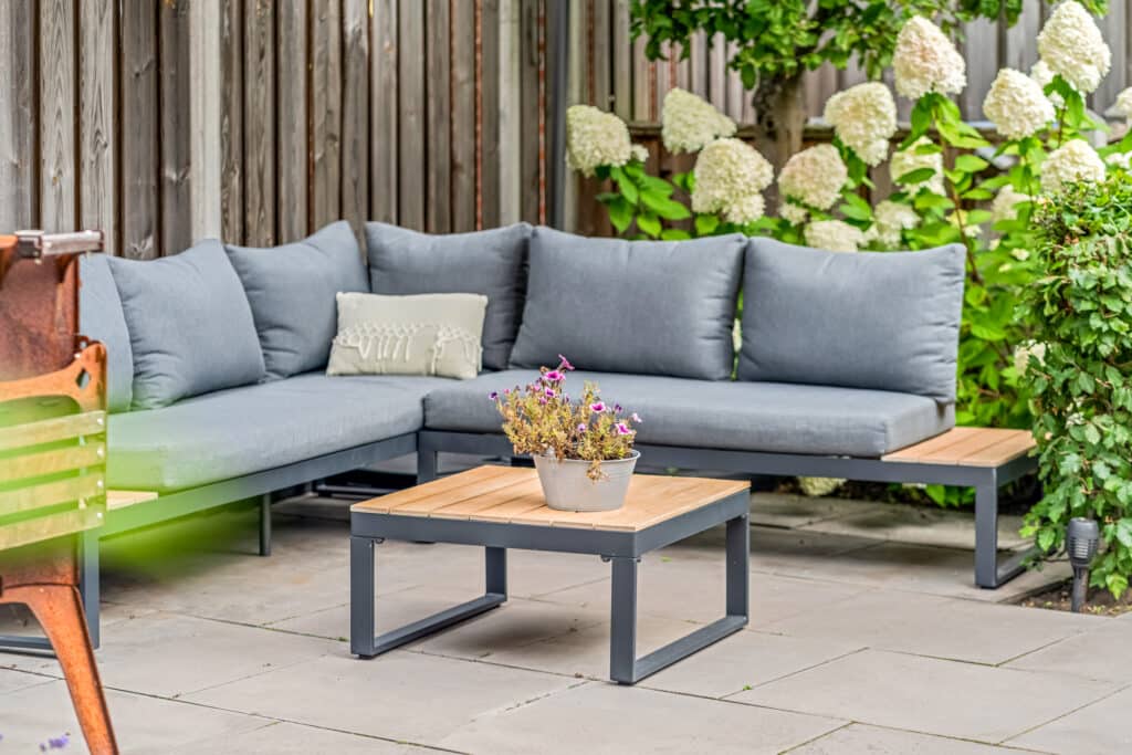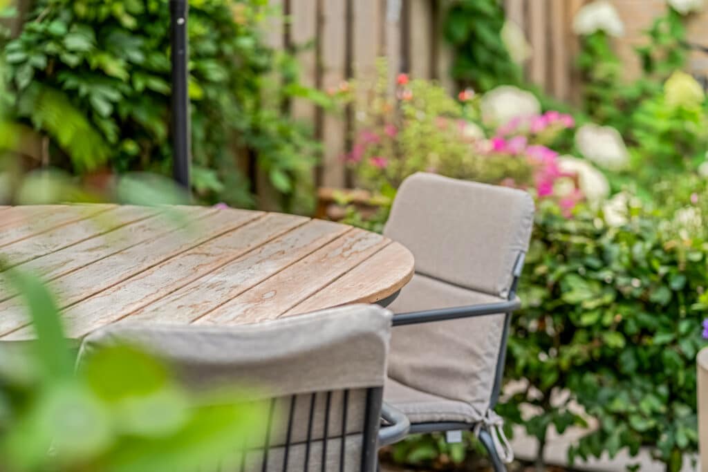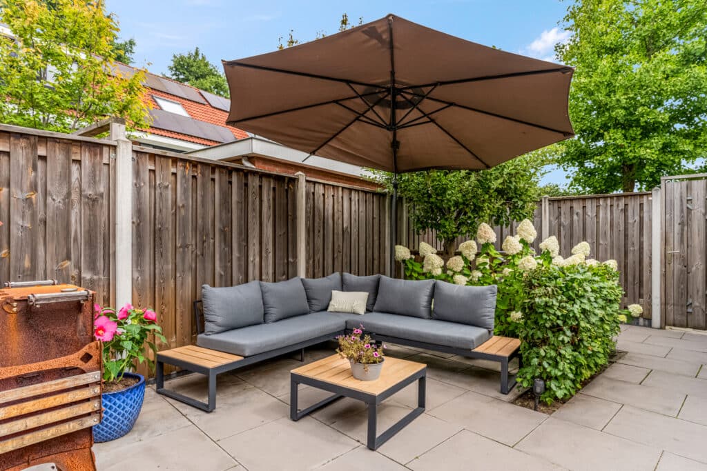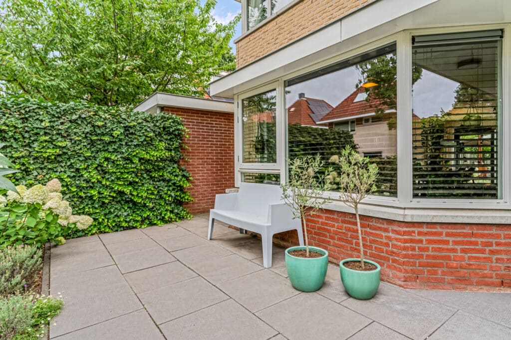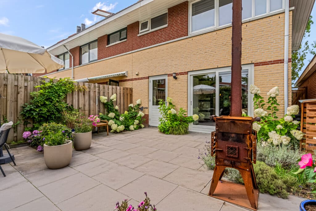 De achtertuin is een fijne mix van groen en bestrating, met grijze terrastegels, borders en meerdere plekken om een terras te creëren. Hier kun je op elk moment van de dag een plekje in de zon of schaduw vinden. Het stenen schuurtje biedt praktische bergruimte en via de achterom is de tuin ook gemakkelijk bereikbaar. Een heerlijke plek om te ontspannen, te spelen of gezellig samen te zijn.