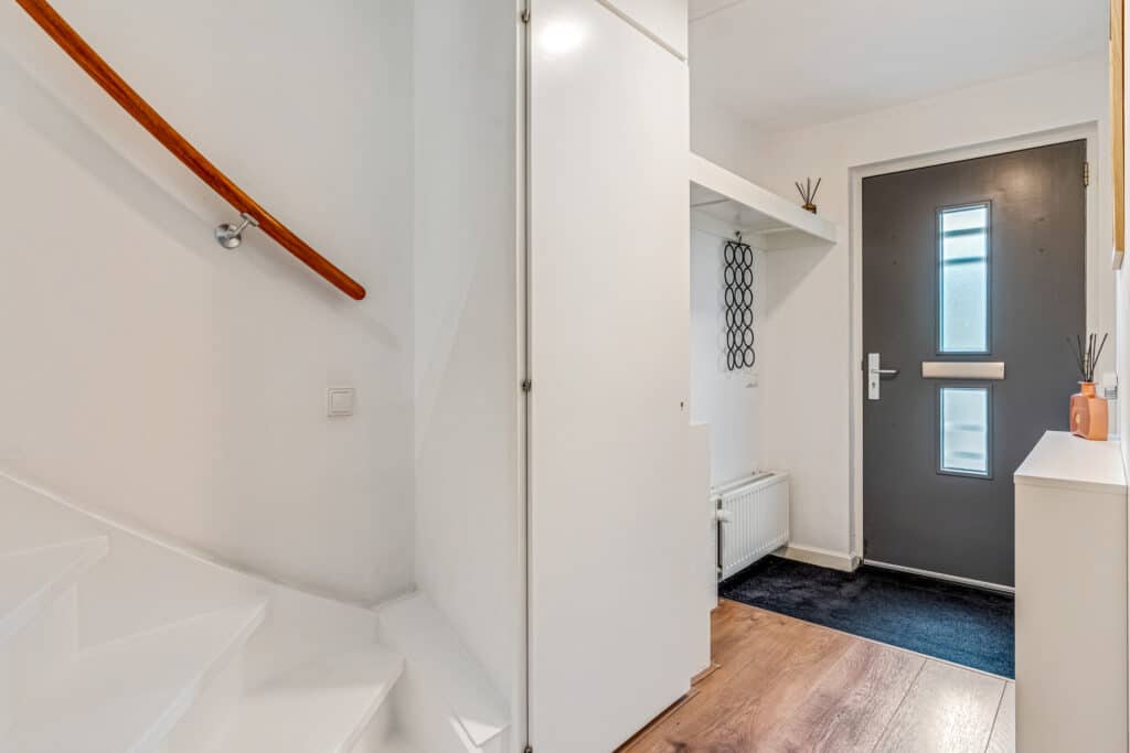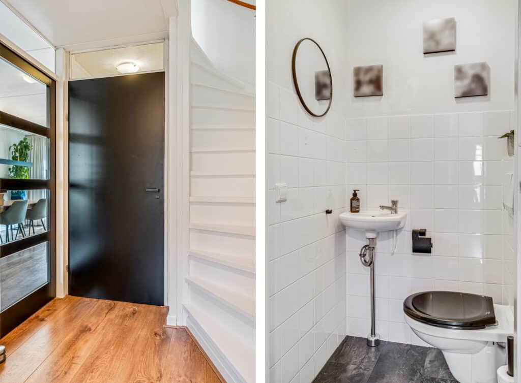 Via de hal met moderne meterkast en toilet met fontein stap je de woning binnen. De begane grond is volledig voorzien van een laminaatvloer en grotendeels uitgerust met vloerverwarming, wat zorgt voor een aangenaam en gelijkmatig comfort. Alles is strak afgewerkt, met gestucte wanden en gespoten plafonds, waardoor de woning direct een frisse en verzorgde indruk maakt.