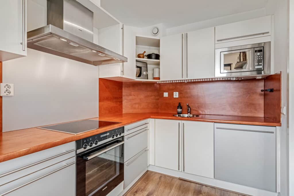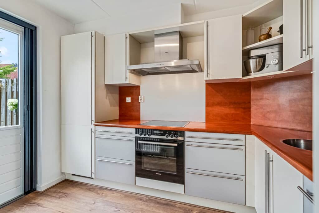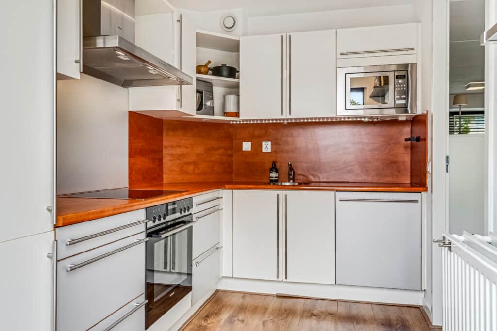 Aan de achterzijde bevindt zich de halfopen keuken in een praktische L-opstelling. Deze keuken biedt volop bergruimte dankzij de vele boven- en onderkasten en is uitgerust met Siemens elektrische kookplaat, oven, inbouwmagnetron en een koel-vriescombinatie. Vanuit de keuken loop je zo de tuin in, ideaal voor zomerse diners of een kop koffie in de ochtendzon.
