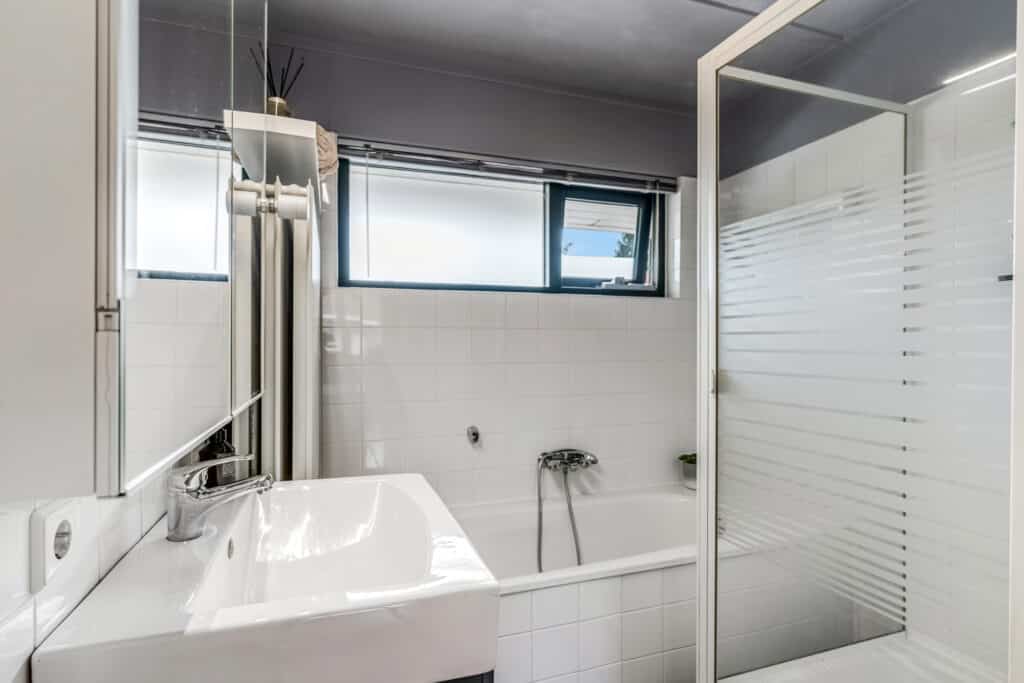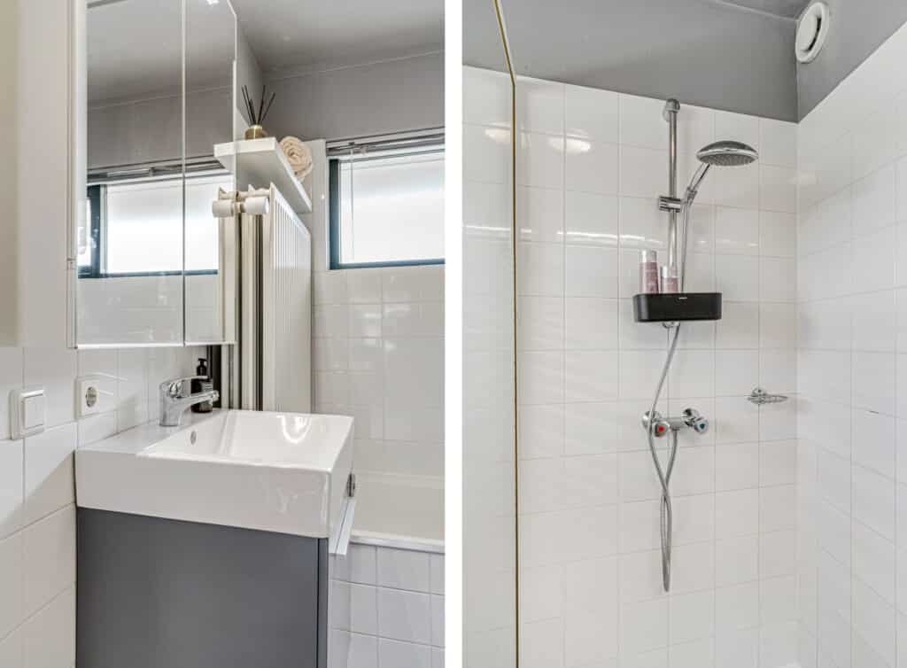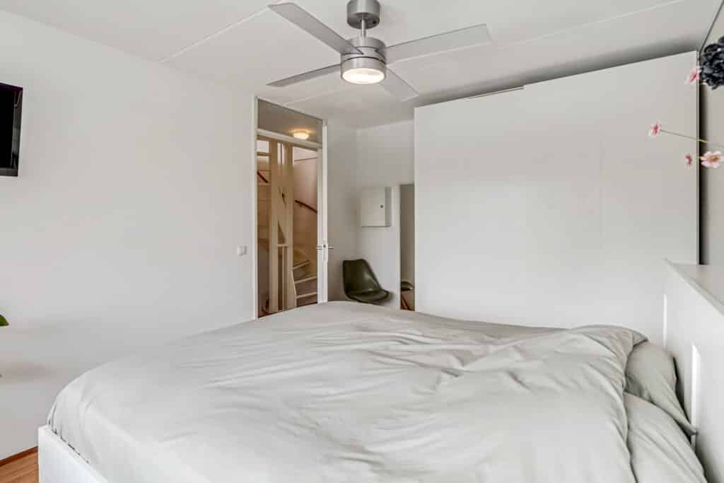 Op de eerste verdieping bevinden zich drie slaapkamers en een badkamer. De grote master bedroom aan de achterzijde is voorzien van een royale schuifkastenwand en straalt rust en comfort uit. Ook hier zijn de wanden glad afgewerkt en de plafonds strak gespoten. De badkamer is neutraal uitgevoerd met wandbetegeling en beschikt over een ligbad, douchecabine en wastafelmeubel. Daarnaast is er op deze verdieping een separaat toilet, wat zorgt voor extra gemak.